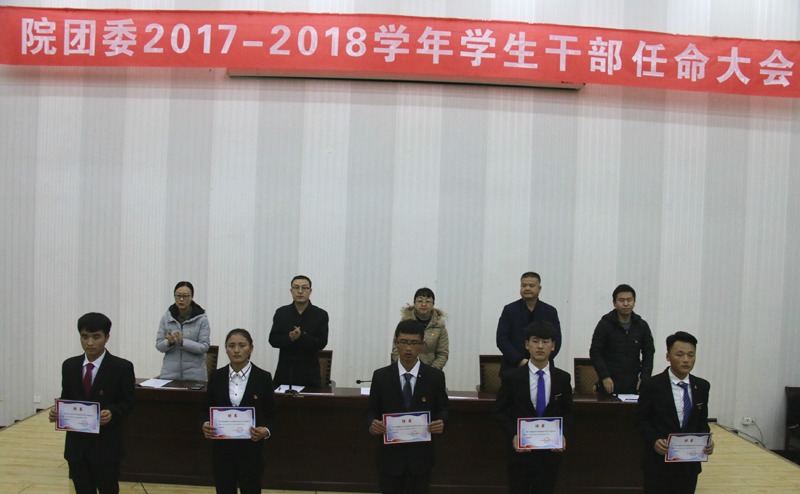 會上,院團委宣讀了《關于2017-2018學年武威職業(yè)學院學生會干部任職的決定》《關于共青團武威職業(yè)學院委員會學生助理任職的決定》《關于武威職業(yè)學院第十一屆學生社團聯(lián)合會學生干部任職的決定》,為學生干部代表頒發(fā)了聘書。