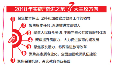 陳寶生指出,黨的十九大對(duì)教育工作作出了全面系統(tǒng)部署。在加快教育現(xiàn)代化、建設(shè)教育強(qiáng)國(guó)的新征程中,解決教育發(fā)展不平衡不充分的問(wèn)題將是我們長(zhǎng)期要面對(duì)的工作主題。要以問(wèn)題為導(dǎo)向,將其作為實(shí)施“奮進(jìn)之筆”的著力點(diǎn)和主攻方向。一是聚焦根本保證,堅(jiān)持和加強(qiáng)黨對(duì)教育工作的領(lǐng)導(dǎo)。要把黨的政治建設(shè)擺在首位,狠抓大抓基層黨組織建設(shè),持之以恒正風(fēng)肅紀(jì),抓好意識(shí)形態(tài)工作。二是聚焦根本任務(wù),系統(tǒng)推進(jìn)立德樹(shù)人。要把德育擺在更加重要的位置,堅(jiān)定青少年理想信念,改進(jìn)和加強(qiáng)思想政治工作,大力發(fā)展素質(zhì)教育,加強(qiáng)語(yǔ)言文字工作。三是聚焦人民群眾關(guān)切,不斷完善公共教育服務(wù)體系。要促進(jìn)學(xué)前教育普惠健康發(fā)展,加快城鄉(xiāng)義務(wù)教育一體化發(fā)展步伐,加大普及高中階段教育攻堅(jiān)力度,加大對(duì)困難地區(qū)扶持力度,切實(shí)加強(qiáng)校園安全。四是聚焦提升貢獻(xiàn)力,大力促進(jìn)教育內(nèi)涵發(fā)展。要以質(zhì)量為本,持續(xù)推進(jìn)職業(yè)教育質(zhì)量提升,健全高等教育內(nèi)涵發(fā)展政策機(jī)制,辦好繼續(xù)教育。五是聚焦激發(fā)活力,縱深推進(jìn)教育改革。要深化“放管服”改革,實(shí)施考招改革“拓展深化”攻堅(jiān)行動(dòng),支持和規(guī)范社會(huì)力量興辦教育,堅(jiān)定不移以開(kāi)放促改革。六是聚焦高素質(zhì)專業(yè)化,全面加強(qiáng)教師隊(duì)伍建設(shè)。實(shí)施教師隊(duì)伍“建設(shè)改革”攻堅(jiān)行動(dòng),健全師德師風(fēng)建設(shè)長(zhǎng)效機(jī)制,完善教師管理制度,提升教師獲得感、幸福感和榮譽(yù)感。七是聚焦保障機(jī)制,夯實(shí)教育事業(yè)基礎(chǔ)。要落實(shí)教育投入責(zé)任,加快教育信息化步伐,全力推進(jìn)依法治教。