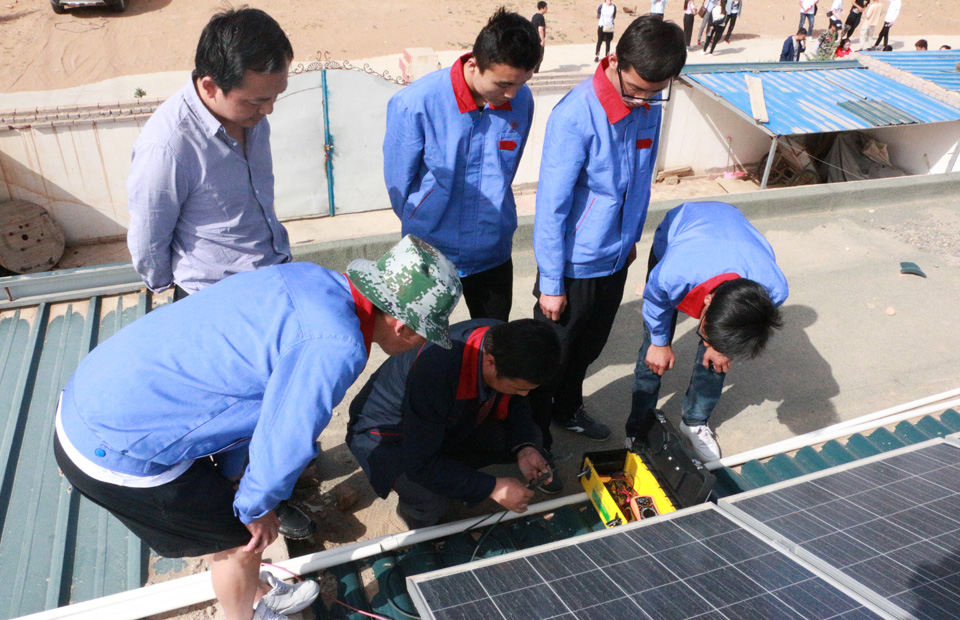 走進(jìn)圓夢新村,由學(xué)院校辦企業(yè)武威泰豐新能源有限公司建設(shè)的200戶貧困家庭戶均3kw的分布式光伏發(fā)電系統(tǒng)映入眼簾。在社區(qū)書記郭林春的帶領(lǐng)下,黨員教師和學(xué)生入黨積極分子上門幫助用戶檢查維修光伏發(fā)電設(shè)備,檢查光伏組件的老化跡象以及所有連接器是否連接緊密、有無腐蝕現(xiàn)象,檢查組件是否接地良好。了解農(nóng)戶的需求,為農(nóng)戶講解光伏設(shè)備后期維護(hù)、電費(fèi)結(jié)算方式以及國家扶貧惠民的政策等知識,并對部分農(nóng)戶屋頂光伏組件故障進(jìn)行了排除,對光伏組件進(jìn)行了大面積清潔維護(hù)。