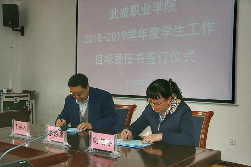 責(zé)任書簽訂儀式上,田迎春代表學(xué)院與各系黨總支書記或負(fù)責(zé)人簽訂了《武威職業(yè)學(xué)院2018-2019學(xué)年度學(xué)生工作目標(biāo)責(zé)任書》。她充分肯定了各系2017-2018學(xué)年的學(xué)生工作,并就我院學(xué)生工作提出了具體要求,一是學(xué)生工作要緊緊圍繞“立德樹人”的根本任務(wù),樹立全院全員育人思想,各系要強(qiáng)化學(xué)生工作管理責(zé)任,增強(qiáng)工作主動性和責(zé)任性,使學(xué)生管理的各項(xiàng)工作更細(xì)、更實(shí);二是各系要在學(xué)生思想政治教育和日常管理工作中堅持誰主管誰負(fù)責(zé)的原則,力求做到“工作規(guī)范化、管理精細(xì)化、服務(wù)人性化”;三是各系及學(xué)工部門在思想上要與學(xué)院保持高度一致,在工作落實(shí)上與學(xué)院保持相向而行,切實(shí)將目標(biāo)責(zé)任書的承諾轉(zhuǎn)化為抓工作、謀發(fā)展、促改革的具體行動;四是要在就業(yè)創(chuàng)業(yè)上下功夫,促進(jìn)畢業(yè)生就業(yè)率有所提高、就業(yè)質(zhì)量不斷上升;五是各系要繼續(xù)發(fā)揚(yáng)勇于創(chuàng)新、開拓進(jìn)取的精神,以更飽滿的熱情、更昂揚(yáng)的斗志、更務(wù)實(shí)的作風(fēng)推進(jìn)我院學(xué)生管理工作的科學(xué)發(fā)展。