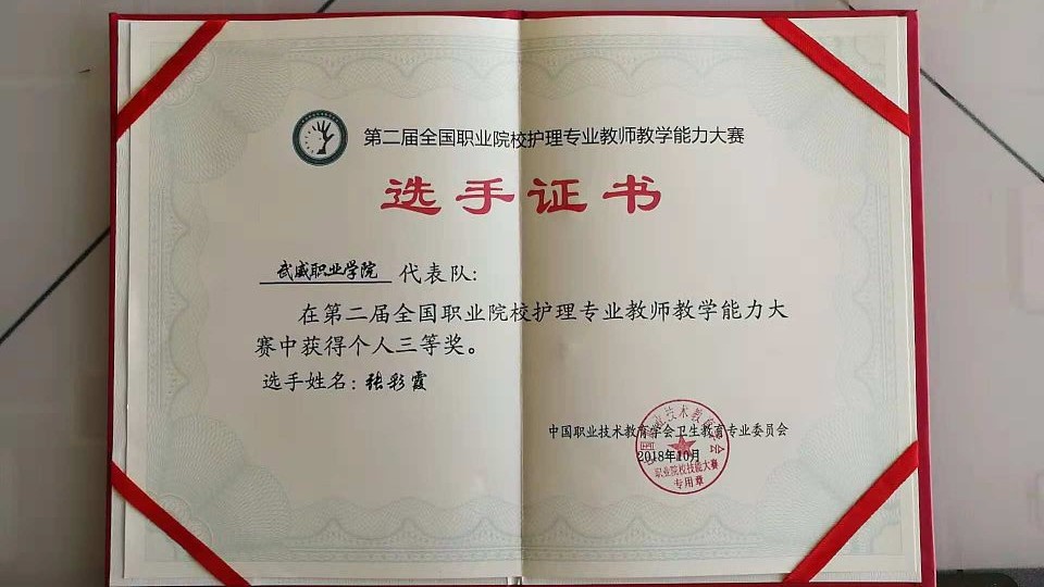 競賽共分為理論考核、說課程和臨床護(hù)理技能操作三個部分。其中,臨床護(hù)理技能操作部又分為三項,心肺復(fù)蘇術(shù)和靜脈輸液操作技術(shù)為必選項目,置胃管技術(shù)和氣管切開護(hù)理技術(shù)為抽選項目。經(jīng)過三天緊張激烈的比拼,通過了全部考核內(nèi)容的綜合評定,最終張彩霞老師獲得了三等獎。