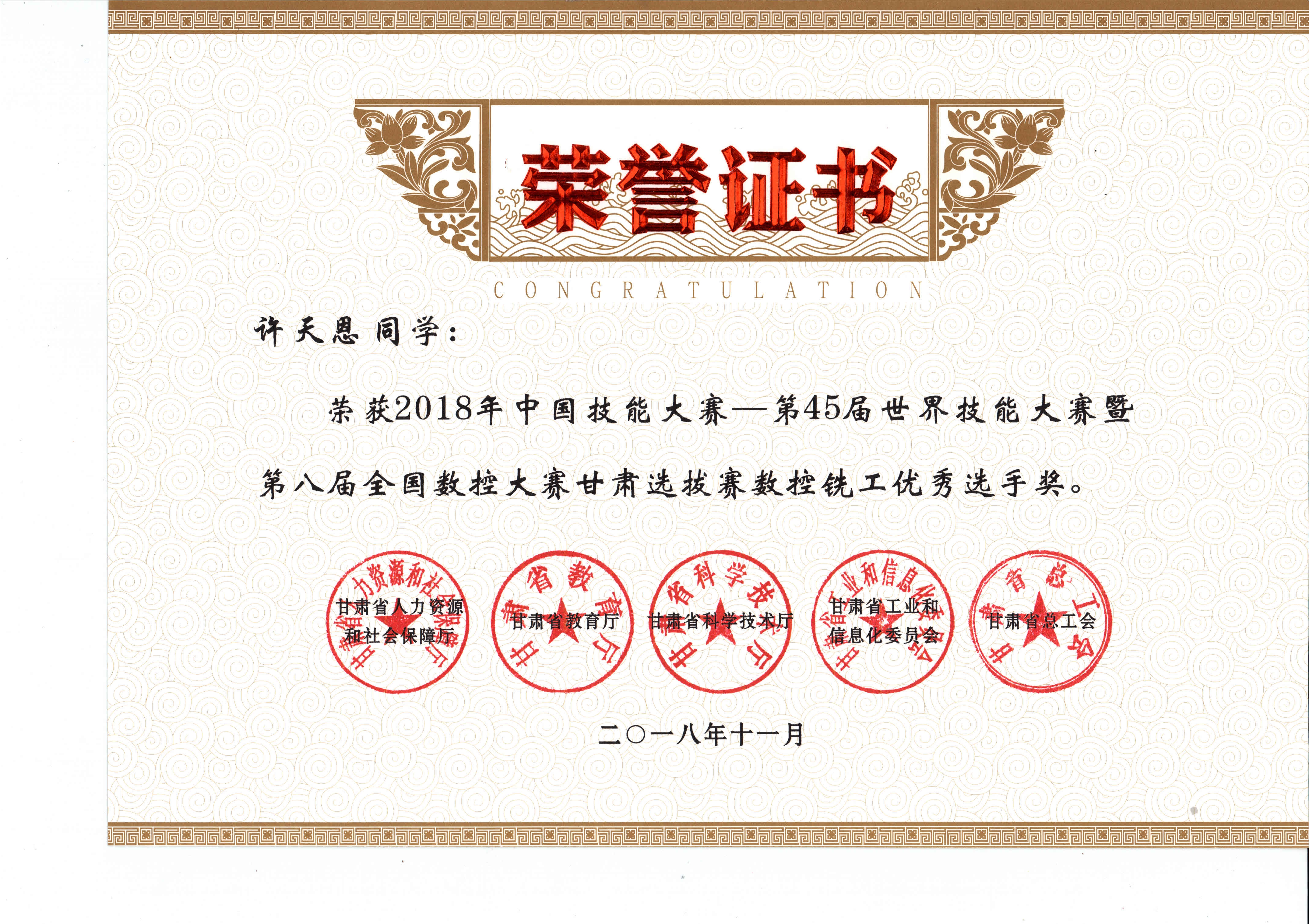 2018年中國(guó)技能大賽--第45屆世界技能大賽暨第八屆全國(guó)數(shù)控大賽甘肅選拔賽(數(shù)控銑工項(xiàng)目)獲獎(jiǎng)證書