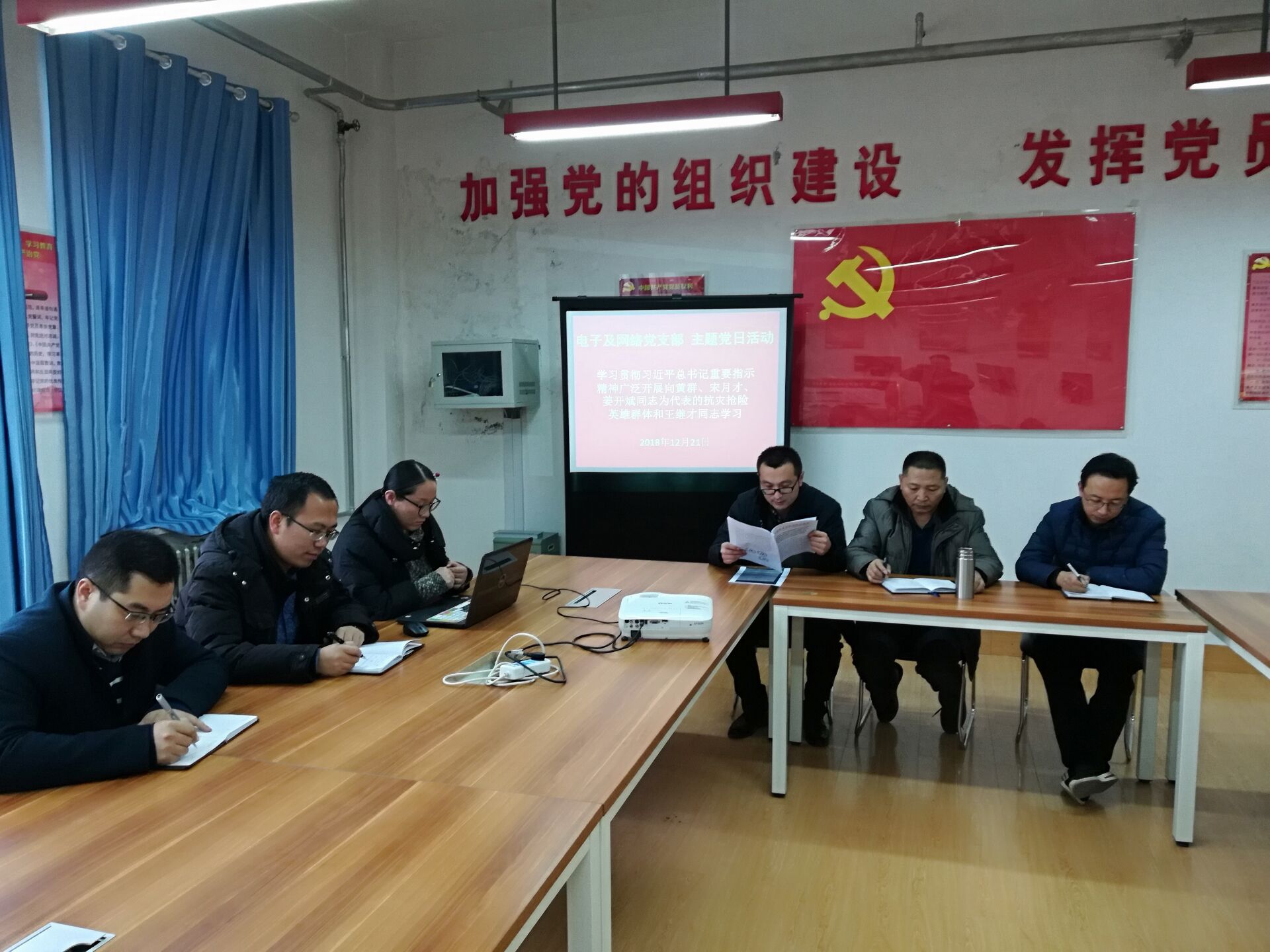 2018年12月21日,電子及網(wǎng)絡(luò)黨支部組織開展“不忘初心、牢記使命——學(xué)習(xí)全國、全省優(yōu)秀共產(chǎn)黨員先進(jìn)事跡”主題黨日活動(dòng),電子及網(wǎng)絡(luò)黨支部全體黨員參加學(xué)習(xí)。