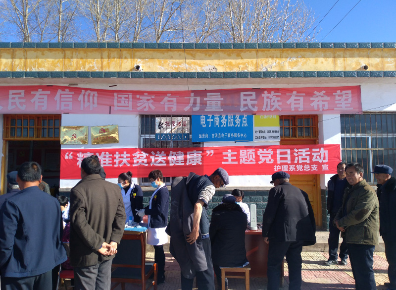 為深入學習宣傳貫徹黨的十九大精神及健康扶貧等惠民政策,減少出現(xiàn)“因病致貧”、“因病返貧”,11月23日,護理系黨總支組織黨員教師到我院精準扶貧點古浪縣黑松驛鎮(zhèn)尚家臺村開展“健康扶貧,送醫(yī)送藥”主題黨日活動。