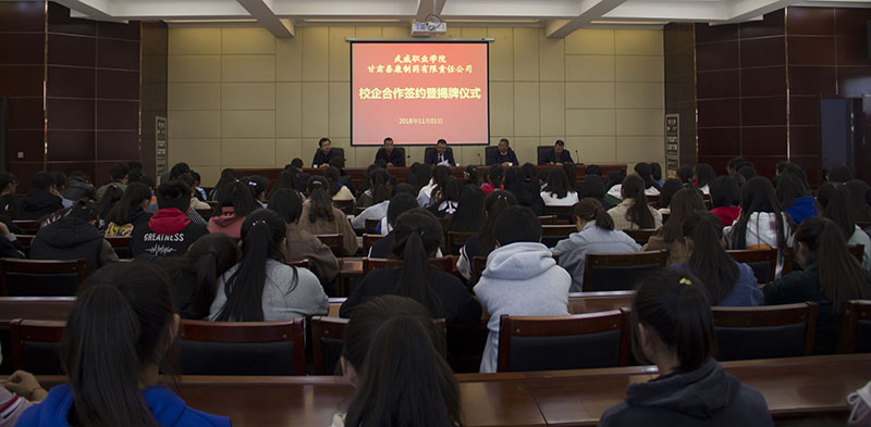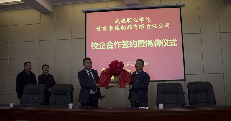 為提高人才培養(yǎng)質(zhì)量和辦學(xué)水平,加強校企協(xié)同育人機制建設(shè),2018年11月1日下午,藥學(xué)系與甘肅泰康制藥有限責(zé)任公司校企合作共建“就業(yè)實習(xí)基地”簽約揭牌儀式在行樹樓北側(cè)會議室隆重舉行。甘肅泰康制藥有限責(zé)任公司投資方—北京久朝集團產(chǎn)業(yè)中心總監(jiān)楊宏超、公司總工程師毛著鴻、財務(wù)總監(jiān)郝敏等企業(yè)領(lǐng)導(dǎo)出席本次儀式。學(xué)院教務(wù)處處長仲生仁、招生就業(yè)處處長蔡柱山、藥學(xué)系主任魏潤明、副主任楊建美、黨總支副書記單光年及藥學(xué)系160余名師生參加了此次簽約揭牌儀式。儀式由魏潤明主持。