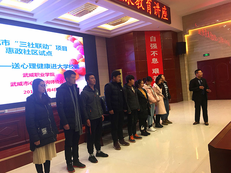 12月4日晚上,學(xué)生工作處聯(lián)合武威市“三社聯(lián)動”惠政社區(qū)試點項目在學(xué)院菁英廳舉辦了心理健康專題講座暨心理信息員培訓(xùn)。此次講座邀請武威市心理咨詢師協(xié)會會長何飛老師主講,學(xué)院各系輔導(dǎo)員、2017級、2018級班級心理信息員、心翼心理社團會員等220多人聆聽了講座。學(xué)生工作處處長王守云主持活動。