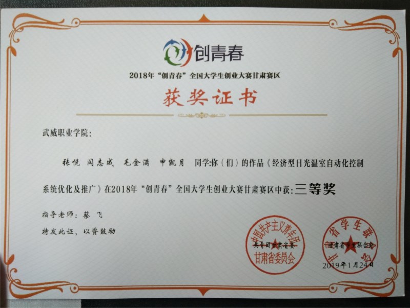 現(xiàn)代農(nóng)業(yè)技術(shù)系兩件作品獲得2018年“創(chuàng)青春”全國大學(xué)生創(chuàng)業(yè)大賽甘肅賽區(qū)三等獎