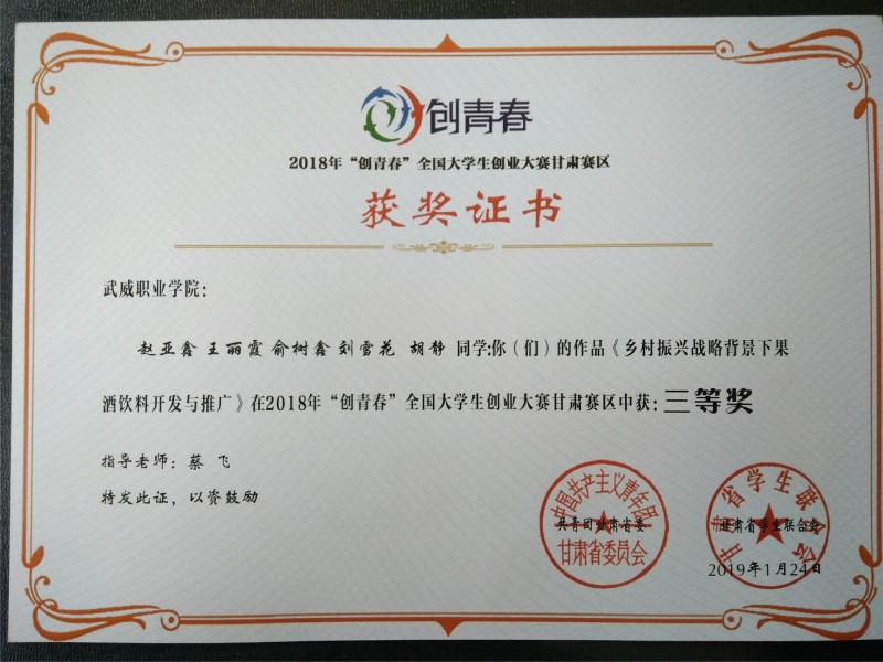 現(xiàn)代農(nóng)業(yè)技術(shù)系兩件作品獲得2018年“創(chuàng)青春”全國大學(xué)生創(chuàng)業(yè)大賽甘肅賽區(qū)三等獎
