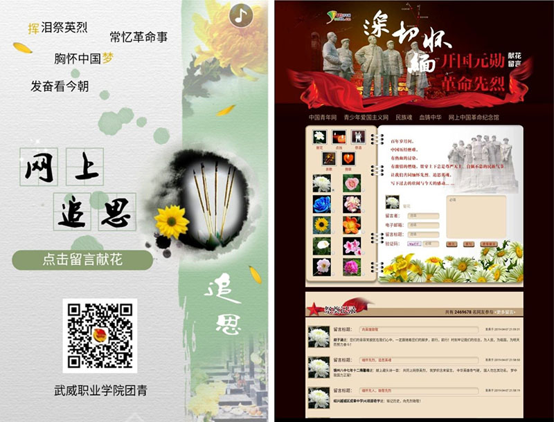 院團(tuán)委在“武威職業(yè)學(xué)院團(tuán)青”微信公眾平臺(tái)開設(shè)清明網(wǎng)上祭英烈專欄,共有3968名同學(xué)參與了線上活動(dòng)。同學(xué)們帶著誠摯的敬意向烈士們鞠躬、獻(xiàn)花,并在留言區(qū)發(fā)表祭掃寄語,以此緬懷先烈的豐功偉績,追憶烈士之德。
