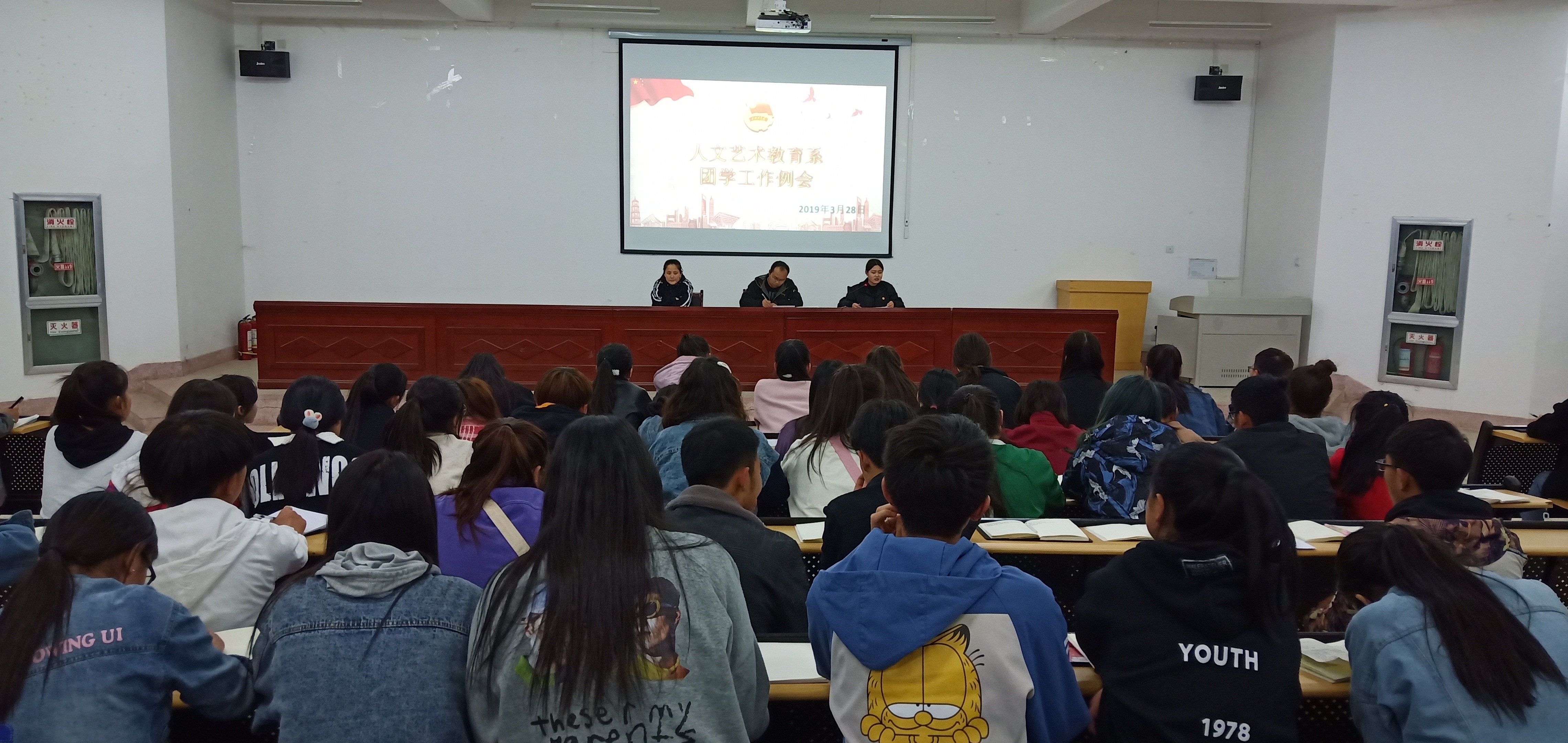 ? ? ? ?3月28日晚,人文藝術(shù)教育系在勵勤樓階梯教室召開了三月份工作例會,人文藝術(shù)教育系分團(tuán)委書記唐鑫基老師、分團(tuán)委全體學(xué)生干部,干事、17、18級各班班委共一百余人參加會議。會議安排部署了本學(xué)期分團(tuán)委共青團(tuán)常規(guī)工作和重點(diǎn)工作,討論通過了《人文藝術(shù)教育系2019年基層共青團(tuán)考核細(xì)則》。