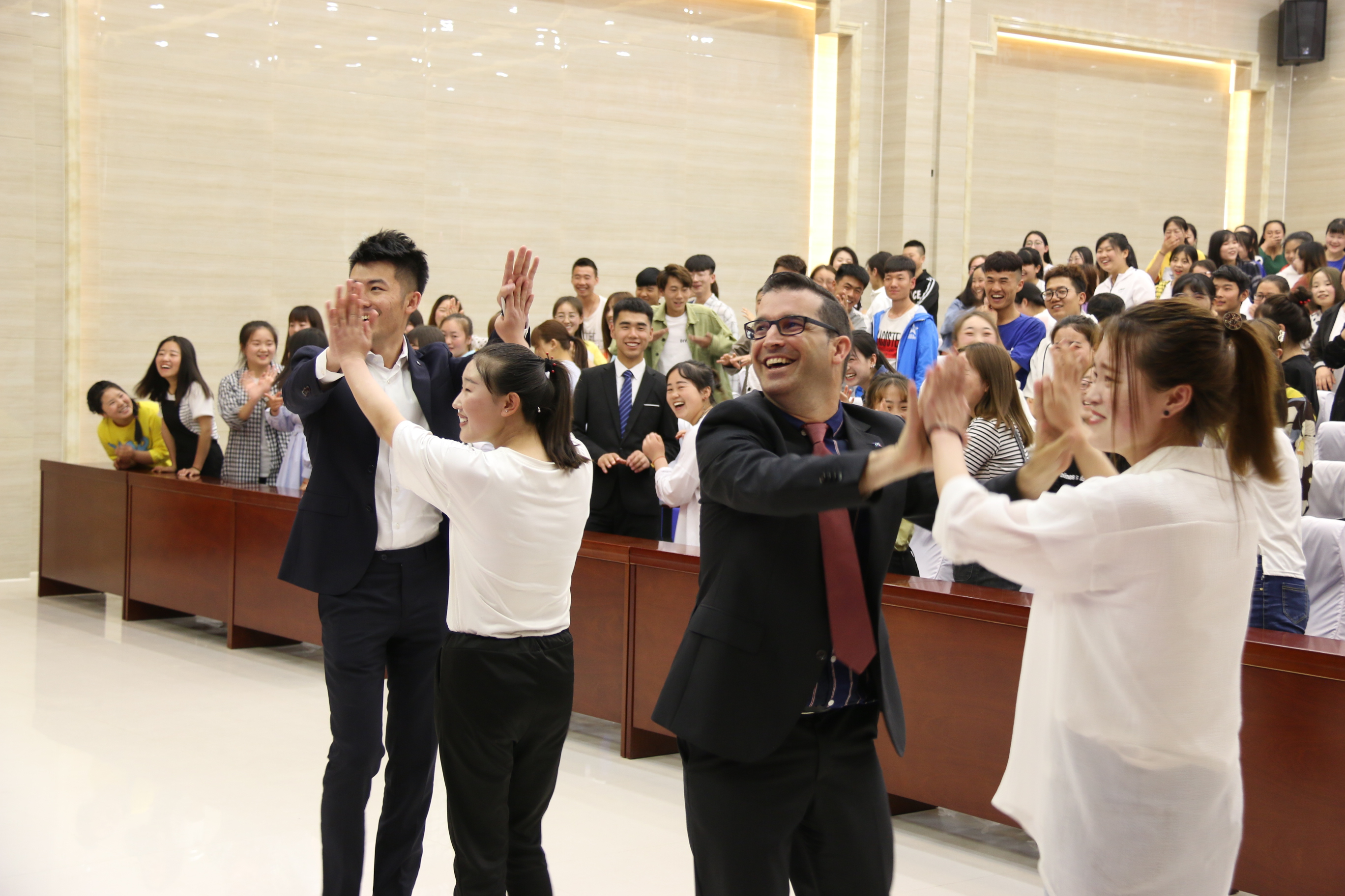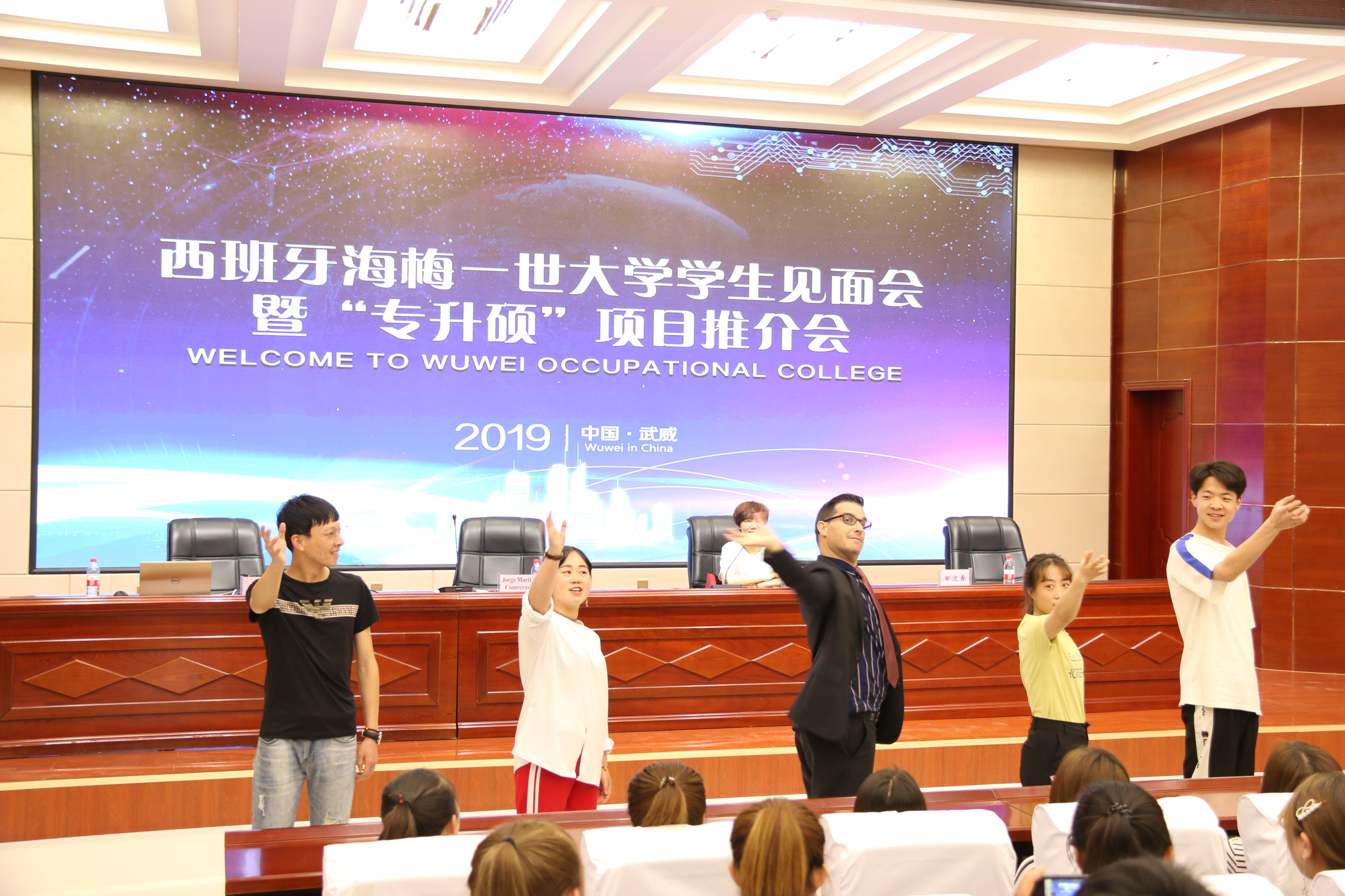 西班牙客人還到菁英廳參加了學院組織的學生見面會。Contreras 先生和同學們進行了語言、歌曲、舞蹈雙向互動,讓在場所有同學體驗了濃烈的西班牙異域文化,同學們近距離感受了西班牙客人的熱情奔放、幽默詼諧。Contreras 先生對學院學生的積極主動、大膽參與互動留下了深刻印象。護理系、人文藝術(shù)教育系、能源工程系、電子信息工程系等系學生代表參加活動。