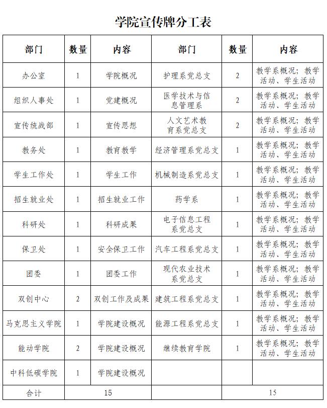 見“學(xué)院宣傳牌分工表”。數(shù)量不夠或者表中未涉及到的部門、單位,如果需要可另行向宣傳統(tǒng)戰(zhàn)部提出申請。