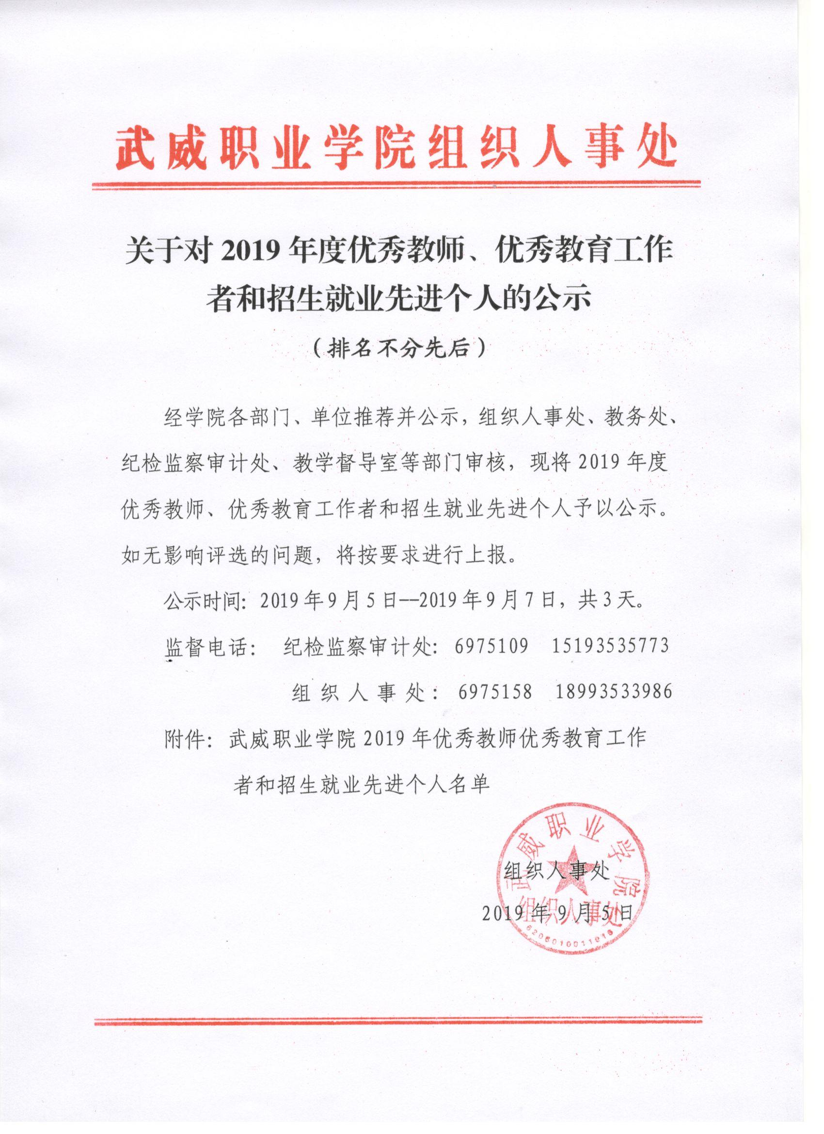 關(guān)于對2019年度優(yōu)秀教師、優(yōu)秀教育工作者和招生就業(yè)先進(jìn)個人的公示