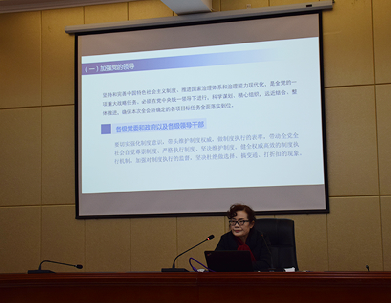 晏素珍以《中共中央關(guān)于堅持和完善中國特色社會主義制度推進國家治理體系和治理能力現(xiàn)代化若干重大問題的決定》的學(xué)習(xí)與解讀為題,重點就全會召開的背景、意義和看點;《決定》的基本框架和主要內(nèi)容以及抓好全會的學(xué)習(xí)貫徹的具體要求進行了宣講。要求廣大師生提高政治站位,樹牢“四個意識”,堅定“四個自信”,做到“兩個維護”,推動全會精神在全系落地生根、取得扎實成效。為實現(xiàn)“兩個一百年”奮斗目標,實現(xiàn)中華民族偉大復(fù)興的中國夢而努力奮斗。