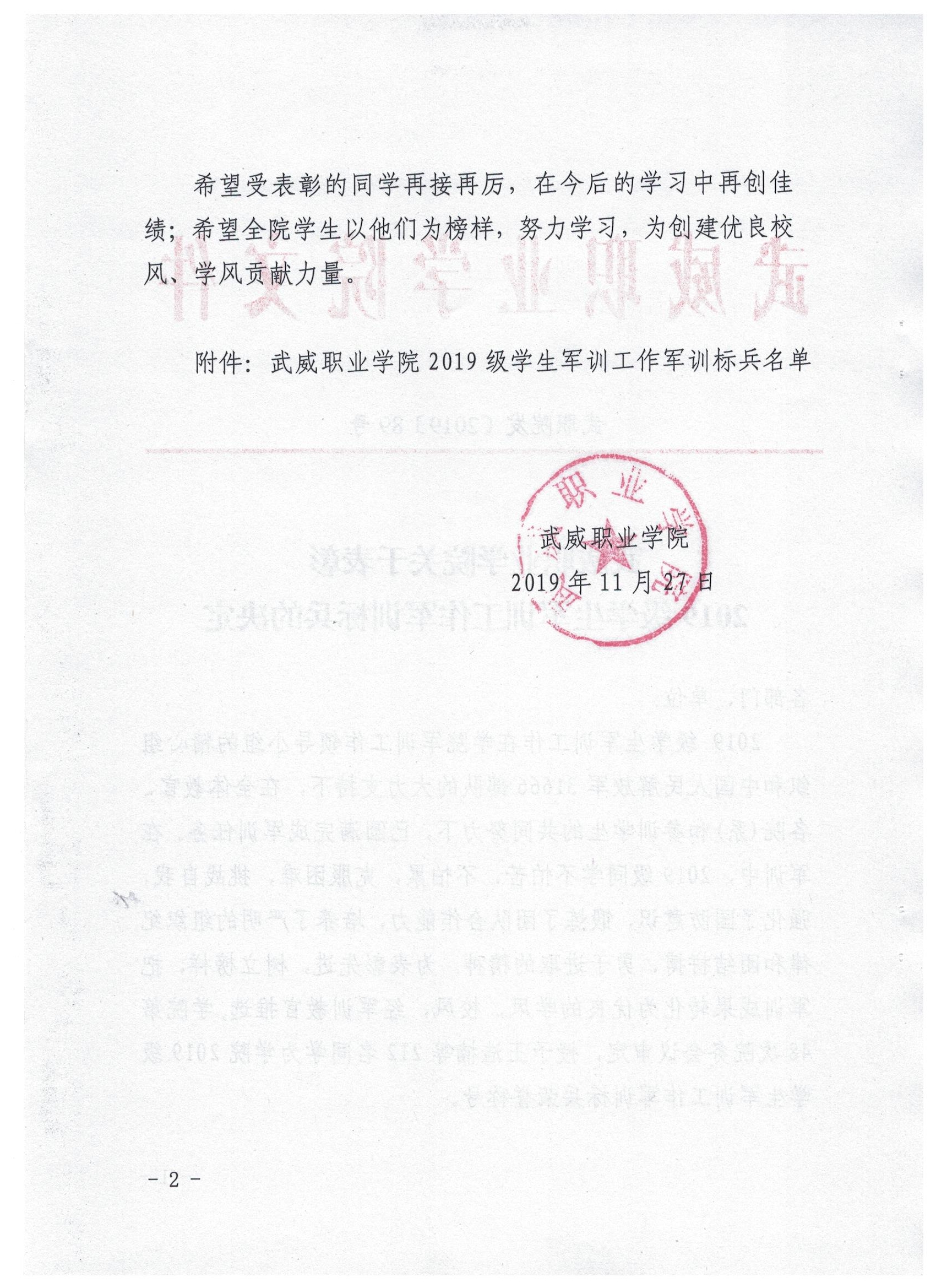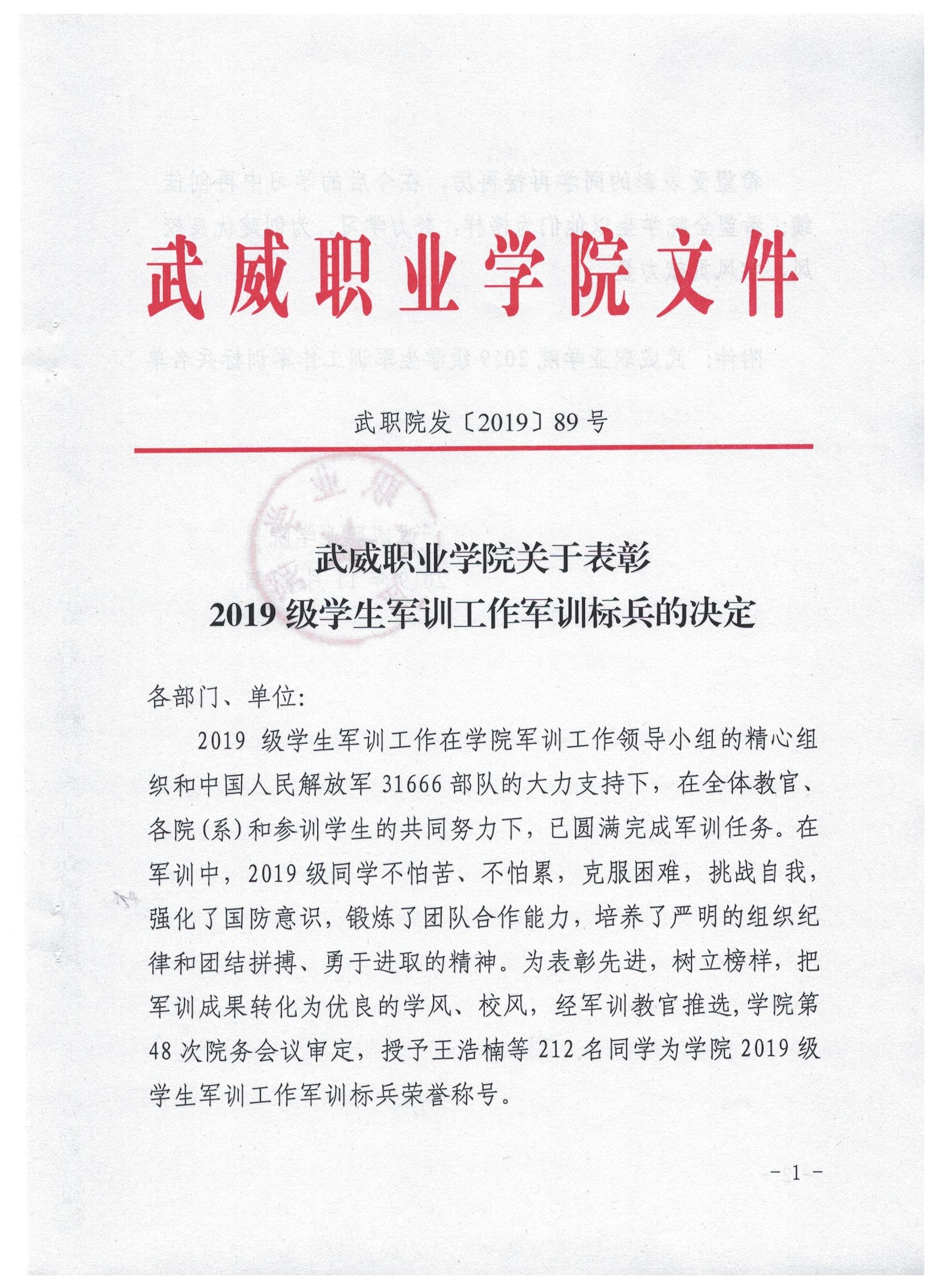 武威職業(yè)學院關(guān)于表彰2019級學生軍訓(xùn)工作軍訓(xùn)標兵的決定