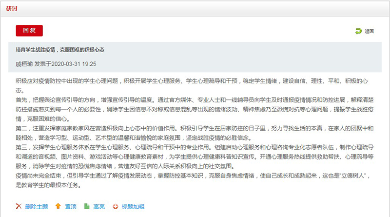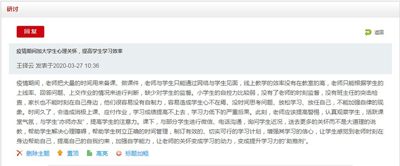 學(xué)生工作處教師姚斌表示,本次培訓(xùn)對輔導(dǎo)員角色定位及工作職責(zé)有了更深一步的認(rèn)知,對開展疫情防控工作、提升危機(jī)處理能力、守護(hù)學(xué)生身心健康起到指導(dǎo)作用,能幫助我們及時掌握特殊時期學(xué)生思想特點和行為特征,指導(dǎo)今后的工作。