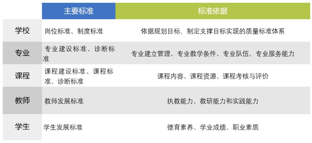 標準制定要體現(xiàn)多元質(zhì)量觀,采用剛性與柔性相結(jié)合的辦法,解決特色發(fā)展與創(chuàng)新發(fā)展的問題,堅持“目標導(dǎo)向與問題導(dǎo)向”的統(tǒng)一。從實際出發(fā),查找問題、研究問題、解決問題,重點解決學校內(nèi)部治理中存在的“透明管理”等突出問題;從專業(yè)建立管理、專業(yè)教學條件、專業(yè)隊伍、專業(yè)服務(wù)能力等維度制定專業(yè)建設(shè)標準和診斷標準;從課程內(nèi)容、課程資源、課程考核與評價等維度制定課程建設(shè)標準、課程標準和課程診斷標準;教師發(fā)展標準要以提升教師的執(zhí)教能力、教研能力和實踐能力為要素;學生發(fā)展標準要重點考慮學生的德育素養(yǎng)、學業(yè)成績、職業(yè)素質(zhì)。通過標準體系的打造,形成學校內(nèi)部質(zhì)量保證體系的標準鏈。