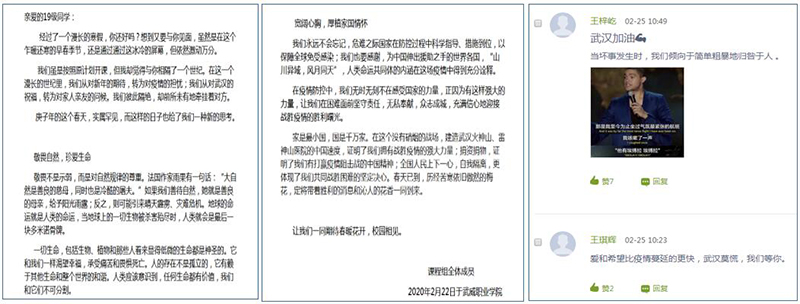 《中華優(yōu)秀傳統(tǒng)文化》課程團(tuán)隊的馮文娟老師在開學(xué)第一天借助在線教學(xué)平臺向?qū)W生推送了《致2019級學(xué)生的一封信》,激勵學(xué)生要敬畏自然、珍愛生命,致敬英雄、感恩榜樣,寬闊心胸、厚植家國情懷。信中這樣寫道:“在疫情防控中,我們無時無刻不在感受國家的力量,正因為有這樣強(qiáng)大的力量,讓我們在困難面前堅守責(zé)任,無私奉獻(xiàn),眾志成城,充滿信心地迎接戰(zhàn)勝疫情的勝利曙光。”“ 家是最小國,國是千萬家。在這個沒有硝煙的戰(zhàn)場,建造武漢火神山、雷神山醫(yī)院的中國速度,證明了我們擁有戰(zhàn)勝疫情的強(qiáng)大力量;捐資捐物,證明了我們有打贏疫情阻擊戰(zhàn)的中國精神;全國人民上下一心,自我隔離,更體現(xiàn)了我們共同戰(zhàn)勝困難的堅定決心。春天已到,歷經(jīng)苦寒依舊傲然的梅花,定將帶著勝利的消息和沁人的花香一同到來?!蓖瑫r,為學(xué)生推送由央視頻和有道精品課共同錄制的《面對疫情教你如何有效防范》疫情防控專題視頻,與學(xué)生一起為打贏新冠肺炎疫情防控阻擊戰(zhàn)貢獻(xiàn)力量。