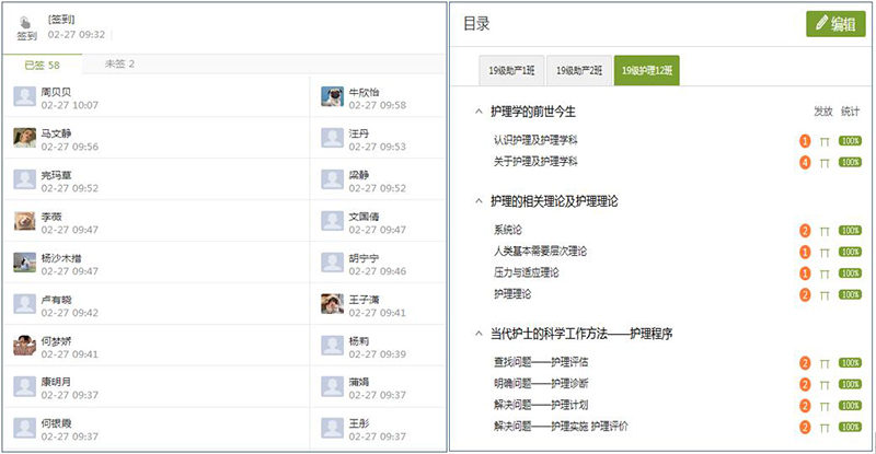 根據(jù)教學(xué)實(shí)際,護(hù)理制定了線上教學(xué)工作方案,對線上教學(xué)工作做出統(tǒng)一安排,強(qiáng)調(diào)了線上教學(xué)督導(dǎo)、任課教師和班主任的具體工作職責(zé)。2月24日,各項教學(xué)工作有序開展。共24名教師完成 11門課程的在線教學(xué)任務(wù),主要依托學(xué)院在線教學(xué)平臺、中國大學(xué)MOOC、人衛(wèi)慕課、智慧職教平臺上完成授課,上課學(xué)生1510人。通過多層次多方位的監(jiān)控數(shù)據(jù)分析,全系在線教學(xué)整體運(yùn)行平穩(wěn)有序,管理人員組織管理到位,教師盡職盡責(zé),課堂授課方式靈活多樣,學(xué)生積極互動,在線教學(xué)課堂效果良好,達(dá)到預(yù)期。學(xué)生平均到課率達(dá)到99%以上,積極落實(shí)了在線教學(xué)對學(xué)生“全覆蓋”的要求。教師在教學(xué)平臺上完成視頻、電子教材、PPT等資源上傳,積極開展課前預(yù)習(xí)、主題討論、隨堂測驗、作業(yè)布置等各類線上課堂教學(xué)活動,充分調(diào)動學(xué)生的學(xué)習(xí)主動性,學(xué)習(xí)效果良好。