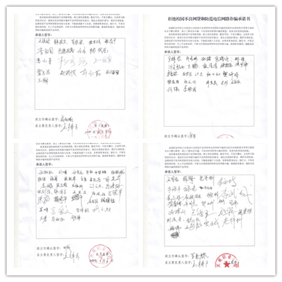 ??對(duì)學(xué)生進(jìn)行校園不良網(wǎng)貸和電信網(wǎng)絡(luò)詐騙的風(fēng)險(xiǎn)告知和防范引導(dǎo)等方面的安全與警示教育,讓學(xué)生了解電信詐騙、不良網(wǎng)絡(luò)貸款等詐騙的類(lèi)型、危害及防范知識(shí)技能。自愿簽訂拒絕不良網(wǎng)貸和防范電信網(wǎng)絡(luò)詐騙承諾書(shū)。