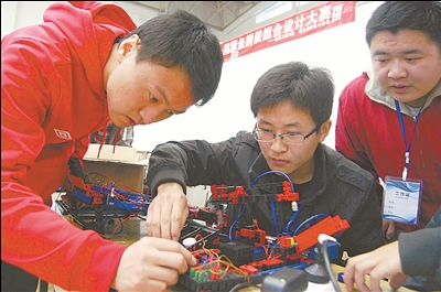 ⑥4月12日,江蘇科技大學(xué)舉辦首屆慧魚機(jī)器人拼裝組合設(shè)計大賽,圖為大學(xué)生在進(jìn)行機(jī)器人拼裝比賽。