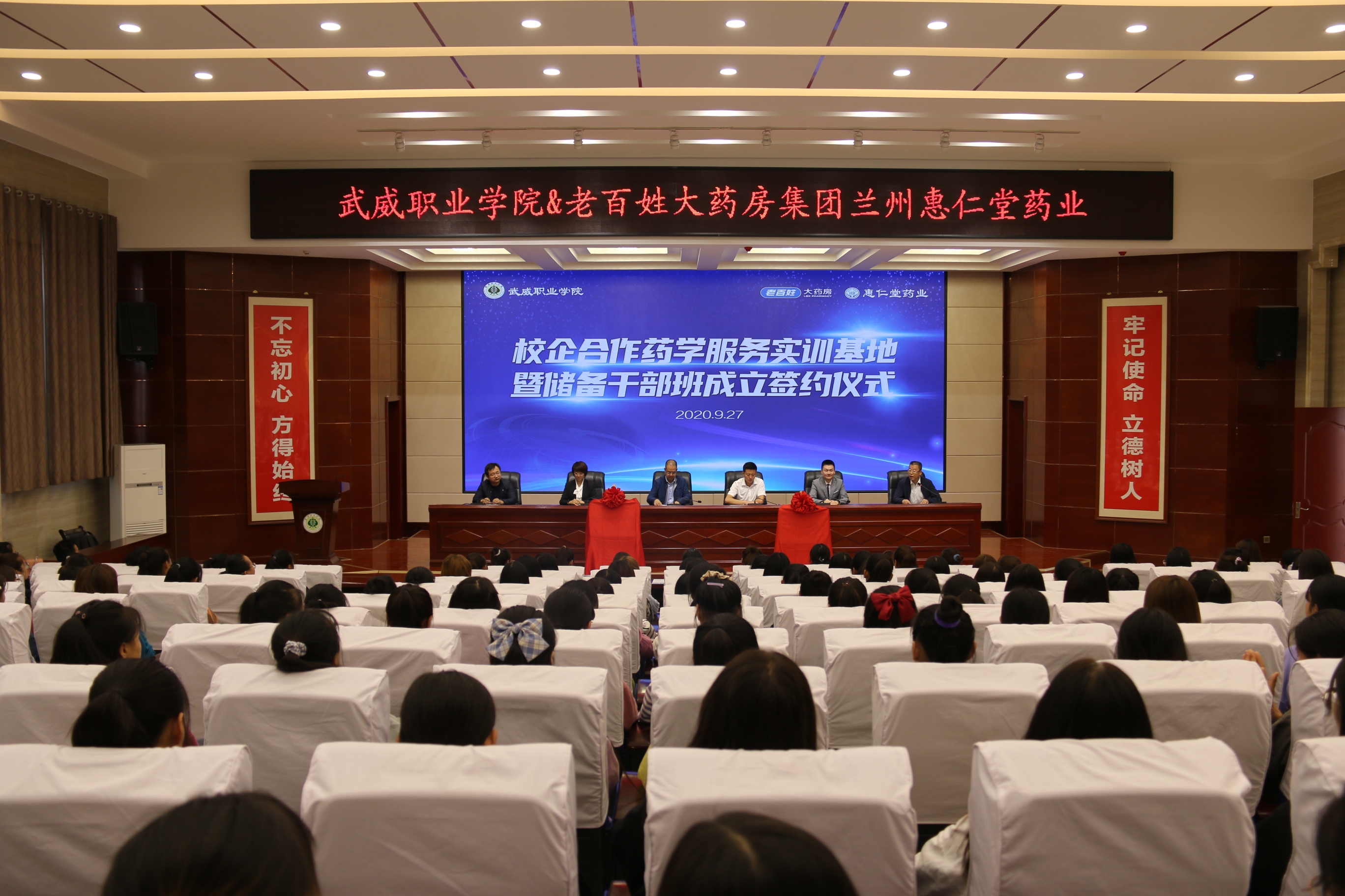 校企合作再起航,實訓又添新力量!9月27日,武威職業(yè)學院藥學系與蘭州惠仁堂藥業(yè)連鎖有限責任公司 “校企合作藥學服務實訓基地”暨儲備干部班成立簽約儀式在菁英廳隆重舉行,武威職業(yè)學院黨委副書記翟存祥,武威職業(yè)學院藥學系黨總支書記、主任魏潤明、武威職業(yè)學院藥學系副主任楊建美,老百姓大藥房集團人才開發(fā)經理李滄,蘭州惠仁堂藥業(yè)連鎖有限責任公司裴子鑫總監(jiān),蘭州惠仁堂藥業(yè)連鎖有限責任公司人力資源部部長岳莉萍共同出席簽約儀式。