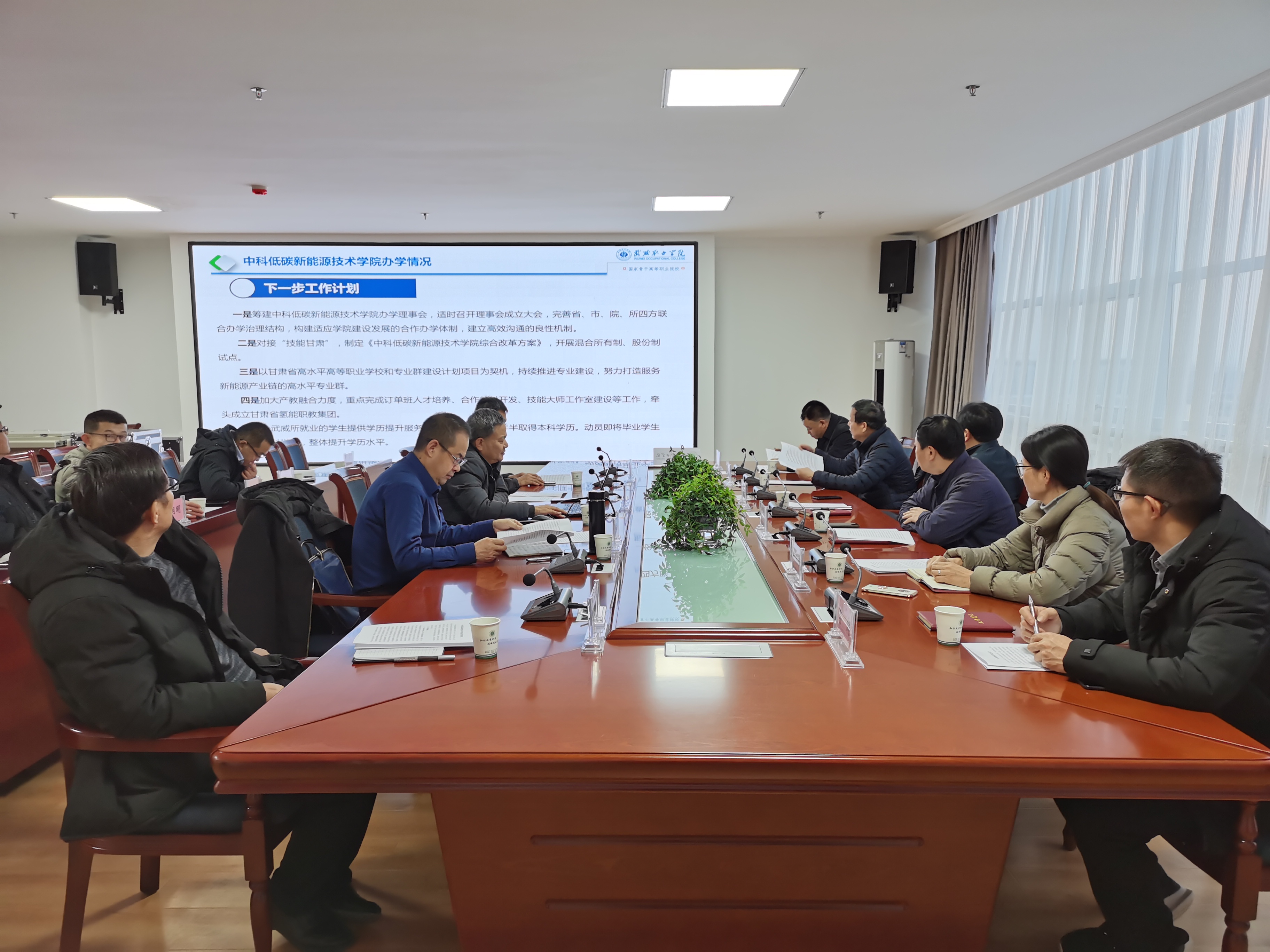 參觀結束后,學院在能源科技樓811會議召開了中科低碳新能源技術學院工作座談會。會上,趙明介紹了學院整合教學資源建設發(fā)展歷程、黨的建設、優(yōu)質校建設、專業(yè)建設、合作辦學、師資隊伍建設、招生就業(yè)、科研服務、對外交流、校企合作和“雙高”院校創(chuàng)建等情況。重點就中科低碳新能源技術學院建設發(fā)展、專業(yè)申報、實驗實訓室建設、教育教學、人才培養(yǎng)和下一步工作計劃等情況進行了詳細介紹。