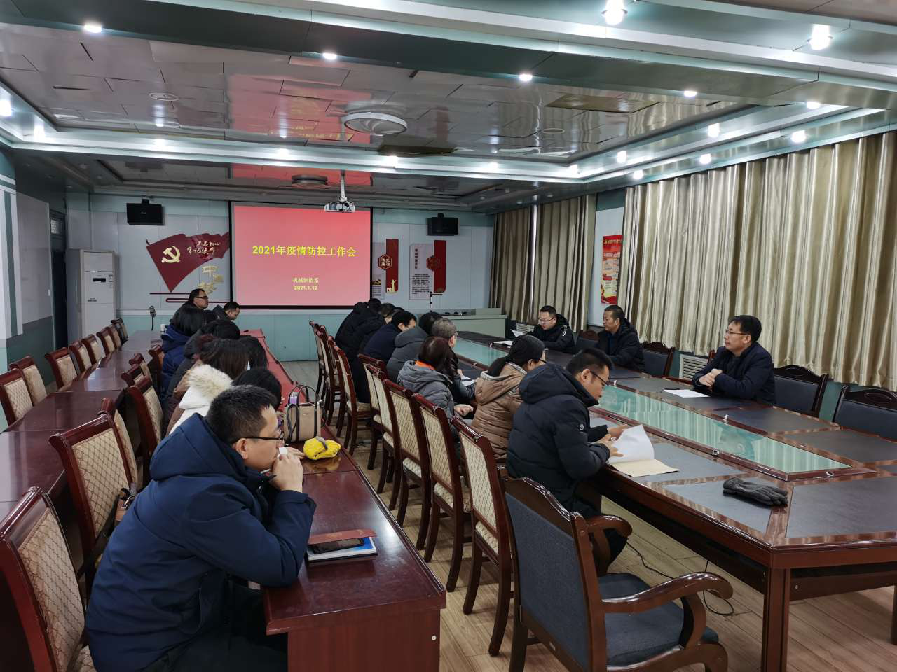 根據(jù)《武威職業(yè)學(xué)院2021年寒假春節(jié)開學(xué)前新冠肺炎疫情防控應(yīng)急處置預(yù)案》和《關(guān)于進(jìn)一步加強寒假期間學(xué)生疫情防控工作的通知》通知要求,1月12日,機械制造系在博學(xué)樓黨員活動室召開疫情防控工作專題會議,傳達(dá)省市、學(xué)院疫情防控要求,部署寒假師生管理和疫情防控工作。