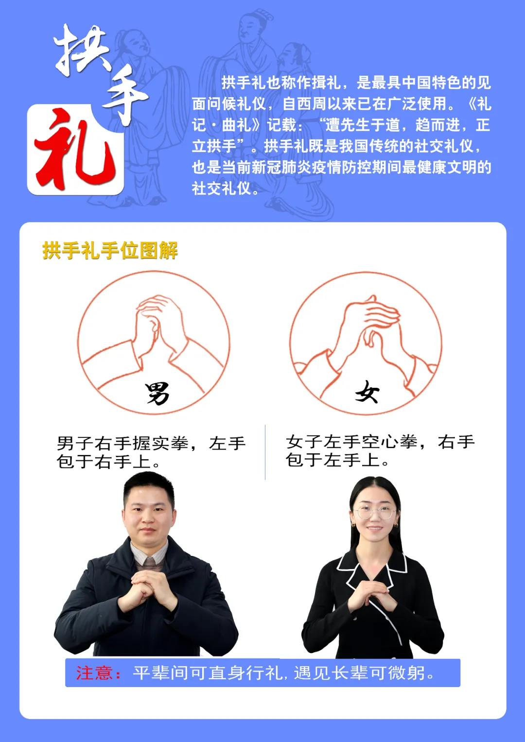 干部職工率先行“拱手禮”?!叭藷o(wú)禮則不生,事無(wú)禮則不成,國(guó)無(wú)禮則不寧?!比悬h政機(jī)關(guān)、企事業(yè)單位干部職工要在工作、生活、社交等各類(lèi)場(chǎng)合率先行“拱手禮”,爭(zhēng)做文明禮儀的先行者、組織者和引領(lǐng)者,積極向身邊的親友宣傳“拱手禮”,推動(dòng)倡導(dǎo)文明新風(fēng)。