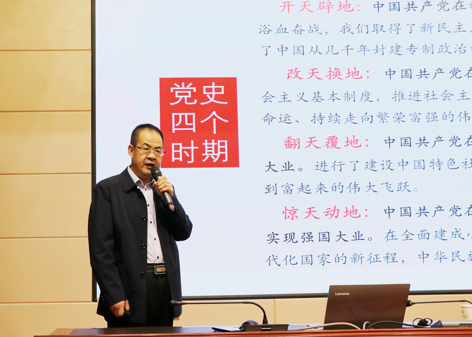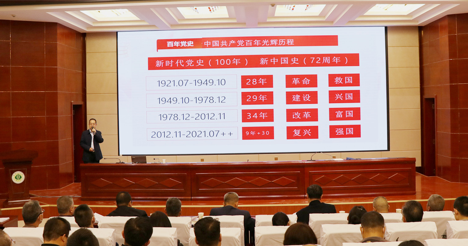 報(bào)告中,翟存祥教授帶領(lǐng)大家再次學(xué)習(xí)了習(xí)近平總書記在黨史學(xué)習(xí)教育動(dòng)員大會(huì)上的講話,進(jìn)一步明確了開展黨史學(xué)習(xí)教育的重大意義。報(bào)告將中國(guó)共產(chǎn)黨百年歷程分為“開天辟地,新民主主義革命時(shí)期;改天換地,社會(huì)主義革命和建設(shè)時(shí)期;翻天覆地,改革開放和現(xiàn)代化建設(shè)時(shí)期;驚天動(dòng)地,中國(guó)特色社會(huì)主義新時(shí)代”四個(gè)歷史發(fā)展階段。從只有中國(guó)共產(chǎn)黨才能拯救中國(guó),中國(guó)人民站起來(lái)了;只有中國(guó)共產(chǎn)黨才能發(fā)展中國(guó),中國(guó)人民富起來(lái)了;只有中國(guó)共產(chǎn)黨才能治理中國(guó),中國(guó)人民強(qiáng)起來(lái)了;堅(jiān)持中國(guó)共產(chǎn)黨的全面領(lǐng)導(dǎo),新中國(guó)取得巨大成就等四個(gè)方面深刻闡述了中國(guó)共產(chǎn)黨百年奮斗的光輝歷程和取得的偉大成就,系統(tǒng)梳理總結(jié)了黨帶領(lǐng)人民推進(jìn)革命、建設(shè)、改革的寶貴經(jīng)驗(yàn)和長(zhǎng)期奮斗中鑄就的偉大精神。