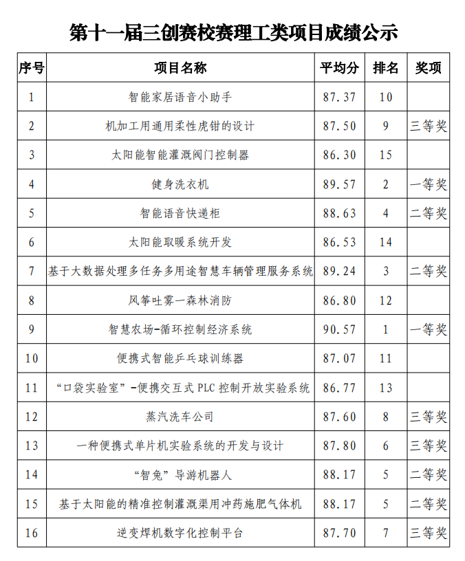 按照第十一屆三創(chuàng)賽省賽組委會(huì)要求,學(xué)院于4月24日在創(chuàng)新創(chuàng)業(yè)中心舉辦了校賽,經(jīng)學(xué)生團(tuán)隊(duì)申報(bào)、現(xiàn)場答辯及專家評審環(huán)節(jié),校賽已圓滿完成。按照校賽方案,一等獎(jiǎng)不超過參賽隊(duì)數(shù)的 10%,二等獎(jiǎng)不超過參賽隊(duì)數(shù)的 20%,三等獎(jiǎng)不超過參賽隊(duì)數(shù)的 30%。現(xiàn)將第十一屆三創(chuàng)賽校賽獲獎(jiǎng)項(xiàng)目成績和獲獎(jiǎng)名次予以公示,公示期三日。