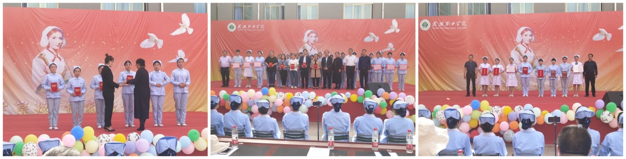頒獎(jiǎng)儀式激勵(lì)同學(xué)們銳意進(jìn)取。伴隨著白衣天使之歌的音樂,學(xué)院領(lǐng)導(dǎo)向2021年甘肅省護(hù)理技能大賽獲獎(jiǎng)選手及學(xué)院第七屆護(hù)理技能大賽獲獎(jiǎng)的團(tuán)體和個(gè)人表示熱烈的祝賀,同時(shí)頒發(fā)獎(jiǎng)狀和榮譽(yù)證書并合影留念。