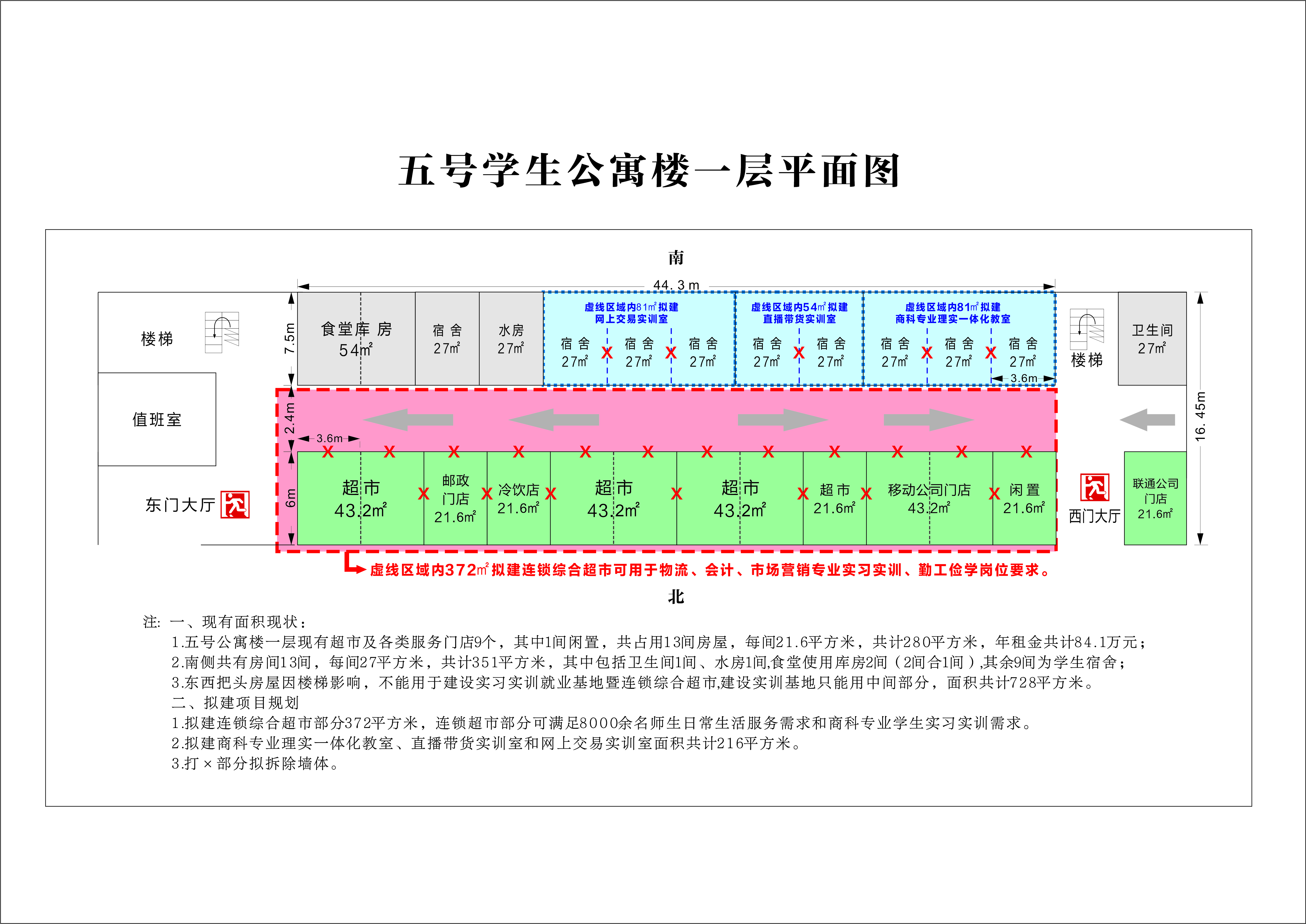 4.學院提供五號學生公寓樓一層面積共計728平方米場地用于建設學院商科專業(yè)所需產(chǎn)教融合實習實訓就業(yè)基地暨連鎖綜合超市,其中,216平方米用于建設商科專業(yè)理實一體化教室、直播帶貨實訓室和網(wǎng)上交易實訓室;372平方米(原商鋪面積為259平方米,增加113平方米為樓道走廊)用于建設連鎖綜合超市及實訓場所,滿足師生日常生活需求和商科專業(yè)學生頂崗實習、實訓、勤工儉學等(改建方案詳見附后平面圖)。建設所需手續(xù)由學院和企業(yè)雙方配合完成辦理。