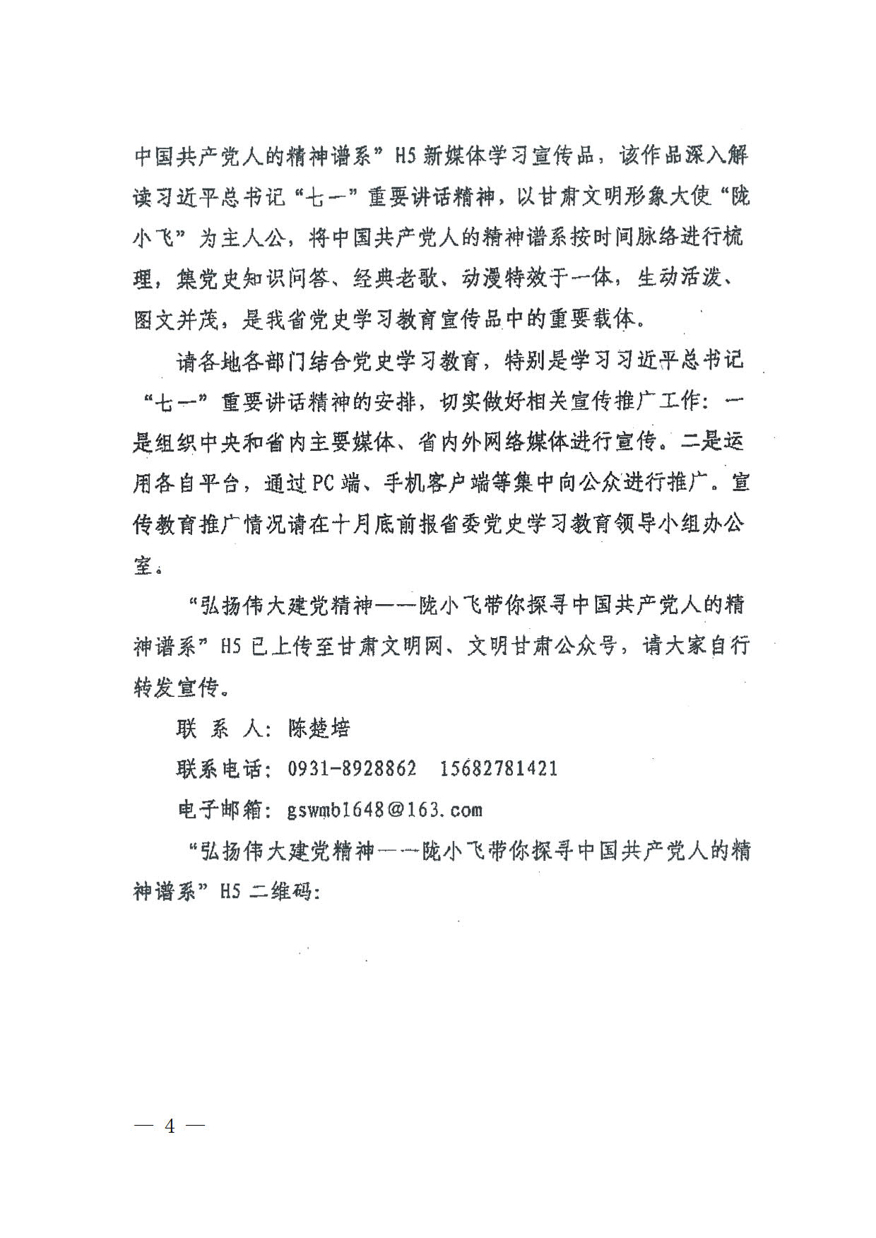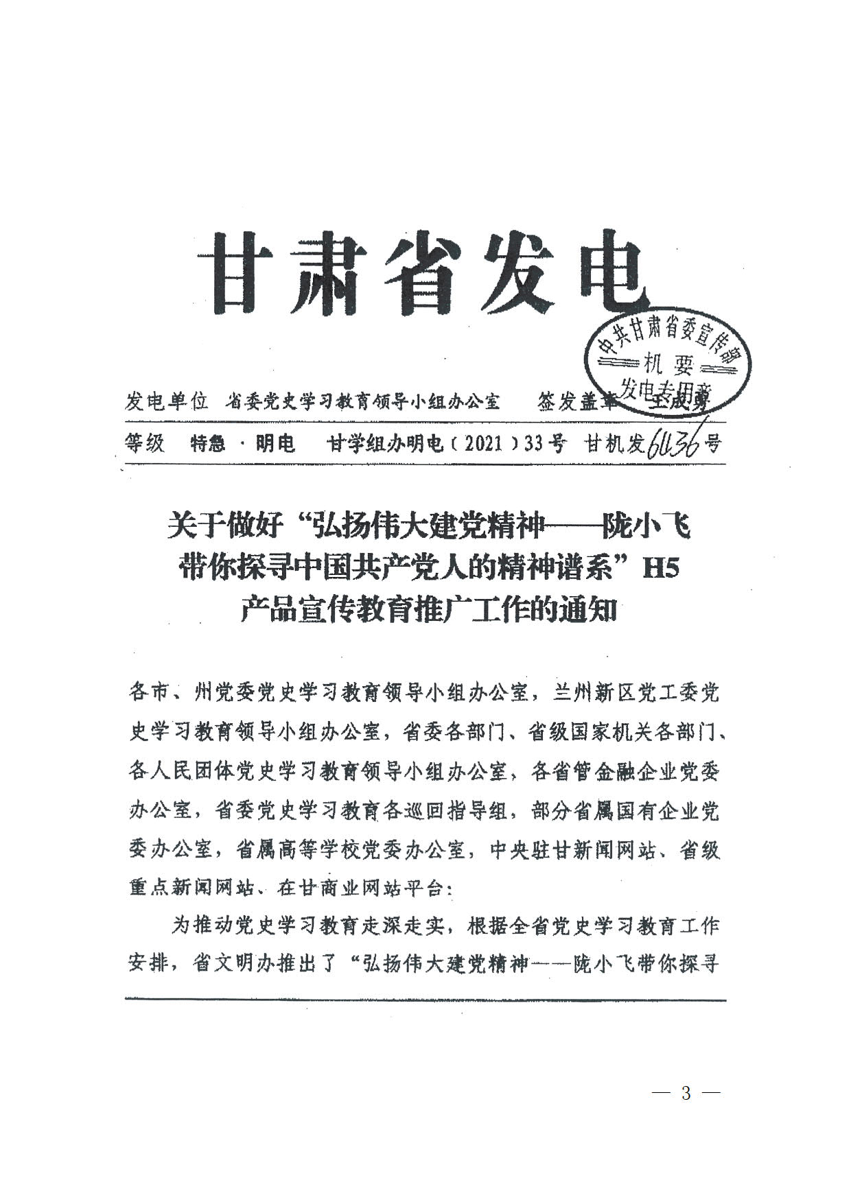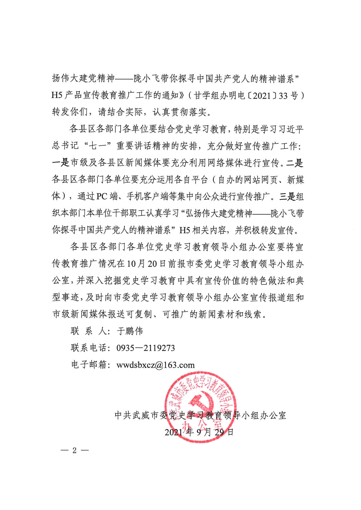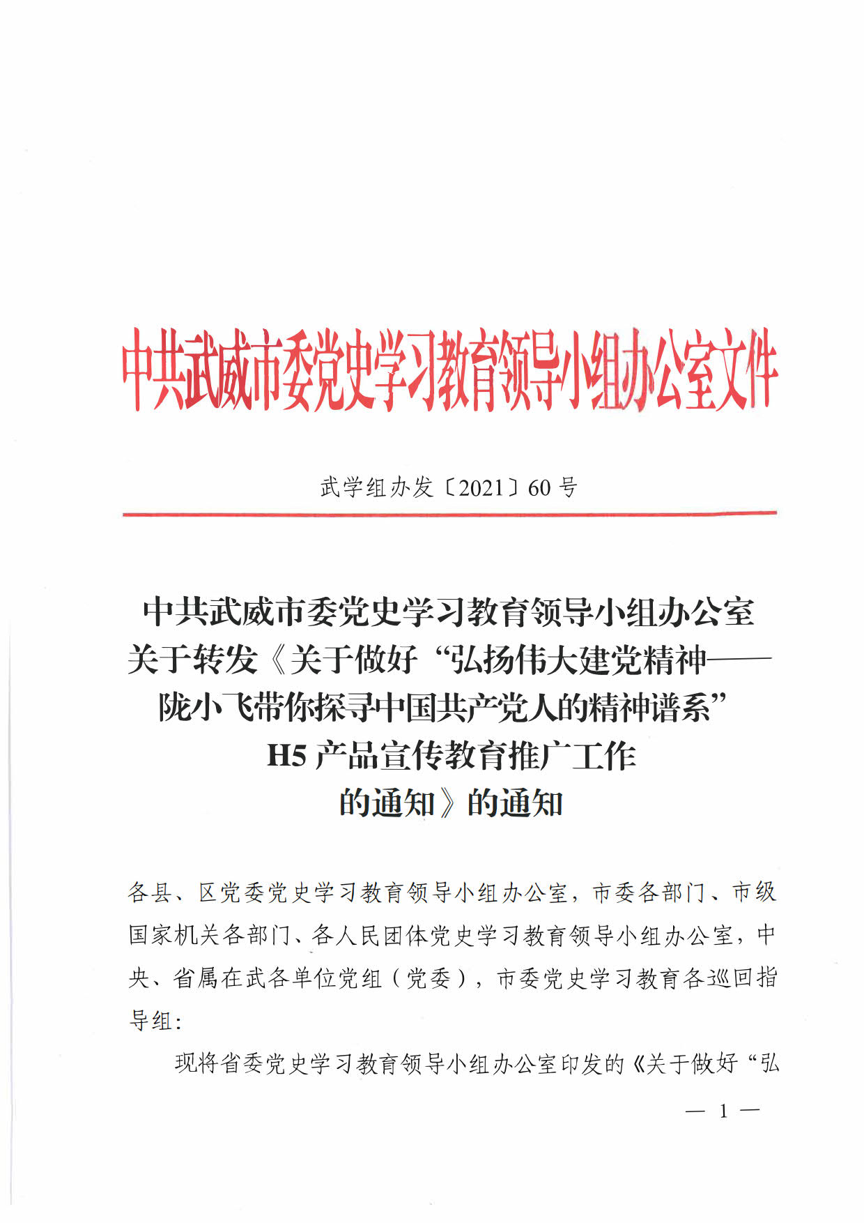 中共武威市委黨史學(xué)習(xí)教育領(lǐng)導(dǎo)小組辦公室關(guān)于轉(zhuǎn)發(fā)〈關(guān)于做好 “弘揚偉大建黨精神——隴小飛帶你探尋中國共產(chǎn)黨人的精神譜系”H5產(chǎn)品宣傳教育推廣工作的通知〉的通知