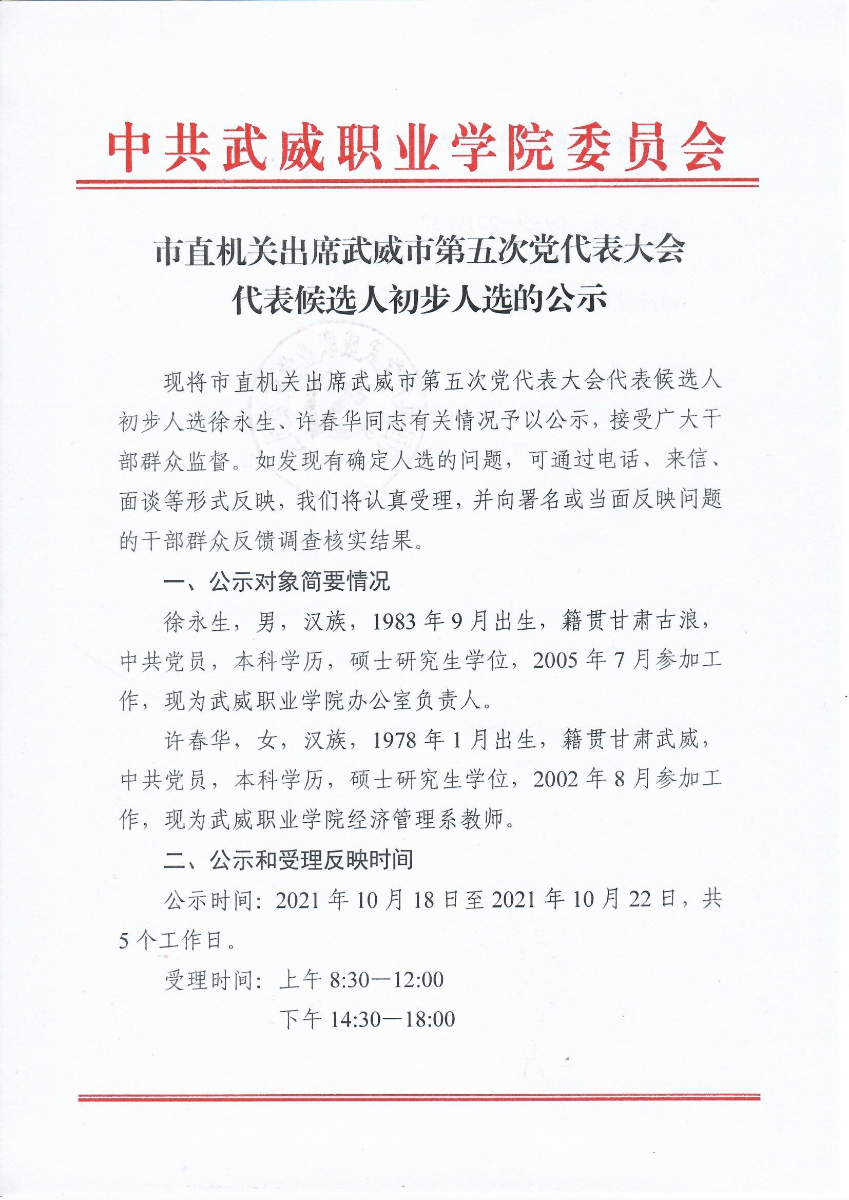 市直機關出席武威市第五次黨代表大會代表候選人初步人選的公示