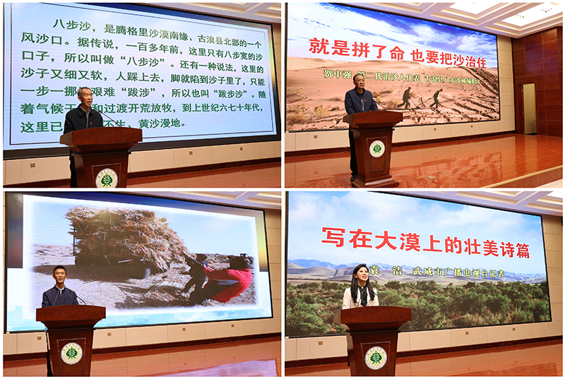 報告會上,二代治沙人代表、八步沙林場場長郭萬剛,二代治沙人代表、八步沙林場職工賀中強,三代治沙人、八步沙林場管護員郭璽、武威市廣播電視臺記者袁潔,分別從綠色承諾、使命責任、接續(xù)奮斗、記者見證等不同角度、不同側面,生動再現(xiàn)了“六老漢”三代人治沙造林持續(xù)改善生態(tài)環(huán)境、讓沙漠披綠生金的感人事跡。在場師生無不為“六老漢”三代人的感人事跡深深震撼,紛紛表示要學習和繼承“六老漢”三代人困難面前不低頭、敢把沙漠變綠洲的奮斗精神,為建設美麗中國、實現(xiàn)中華民族永續(xù)發(fā)展貢獻自己的青春力量。