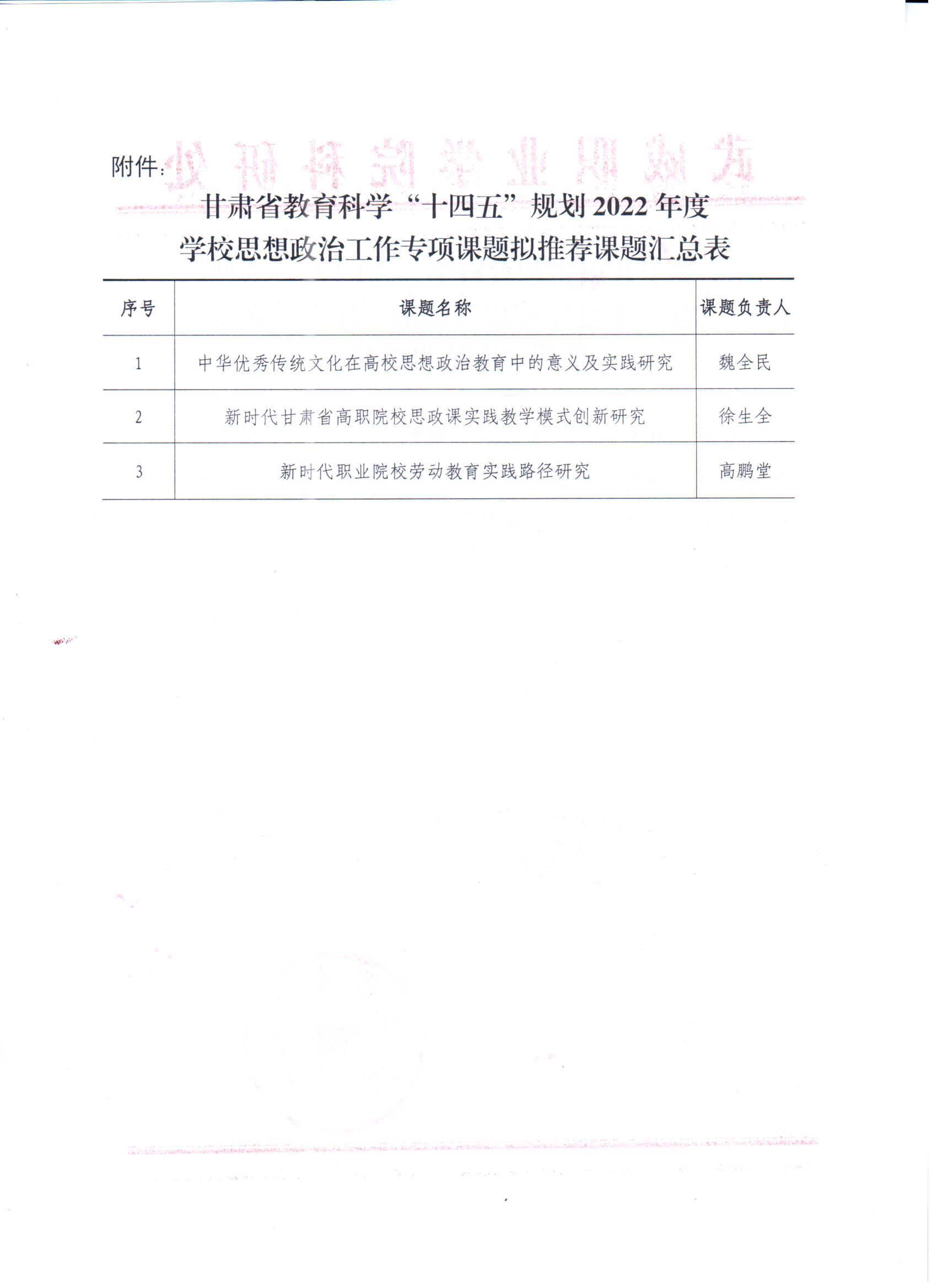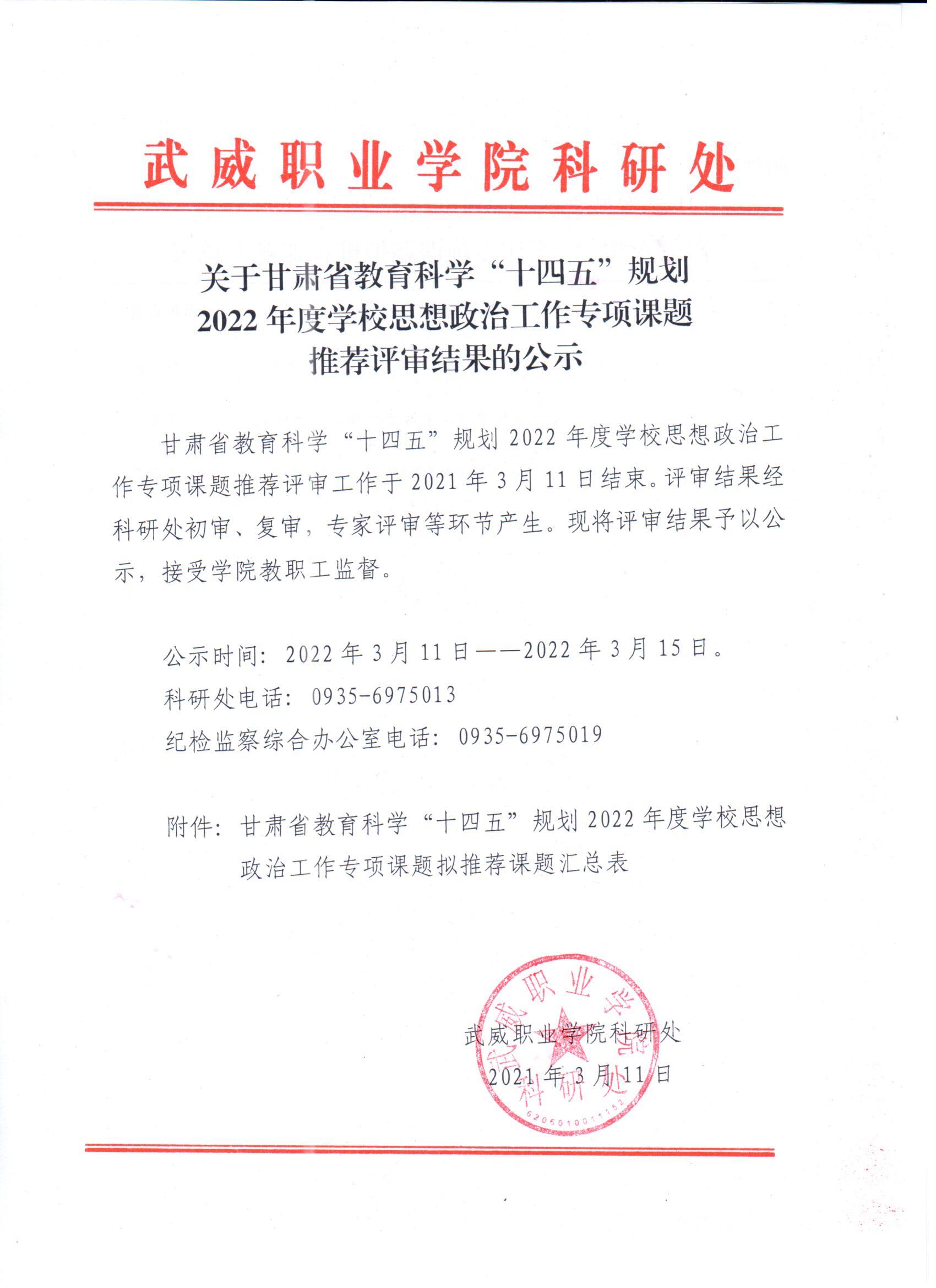 關(guān)于甘肅省教育科學(xué)“十四五”規(guī)劃2022年度學(xué)校思想政治工作專(zhuān)項(xiàng)課題推薦評(píng)審結(jié)果的公示