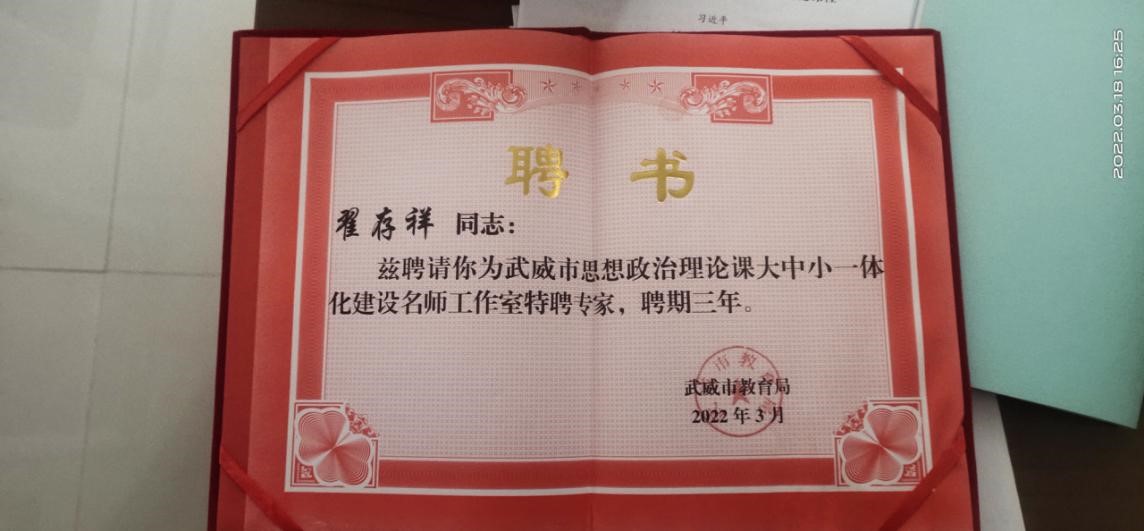 會議學(xué)習(xí)了習(xí)近平總書記在學(xué)校思想政治理論課教師座談會上的重要講話精神,總結(jié)了近年來武威市思政課建設(shè)取得的成績,各縣區(qū)交流了經(jīng)驗(yàn)做法,安排部署了下一階段工作。同時,舉行了武威市思想政治理論課大中小一體化建設(shè)名師工作室授牌和名師工作室特聘專家聘任儀式。學(xué)校思政課名師工作室負(fù)責(zé)人、黨委副書記翟存祥教授被聘為武威市思想政治理論課大中小一體化建設(shè)名師工作室特聘專家。
