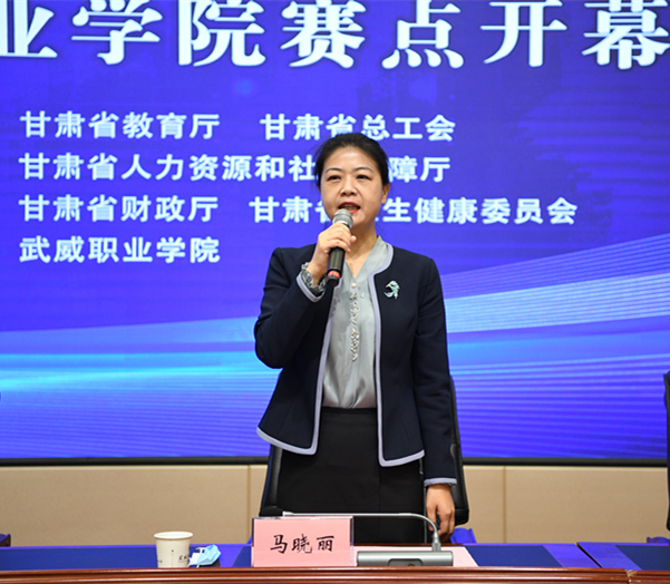 武威市教育局副局長(zhǎng)馬曉麗宣布2022年全省職業(yè)院校技能大賽武威職業(yè)學(xué)院賽點(diǎn)開賽。