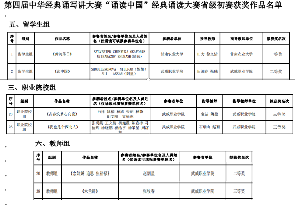 今日,甘肅省教育廳下發(fā)《甘肅省語言文字工作委員會 甘肅省教育廳關(guān)于公布第四屆中華經(jīng)典誦寫講大賽“誦讀中國”經(jīng)典誦讀大賽及“筆墨中國”漢字書寫大賽省級初賽獲獎作品名單的通知》,學(xué)校選送的留學(xué)生組作品《讀中國》榮獲二等獎,并由省教育廳推送參加國賽誦讀大賽;