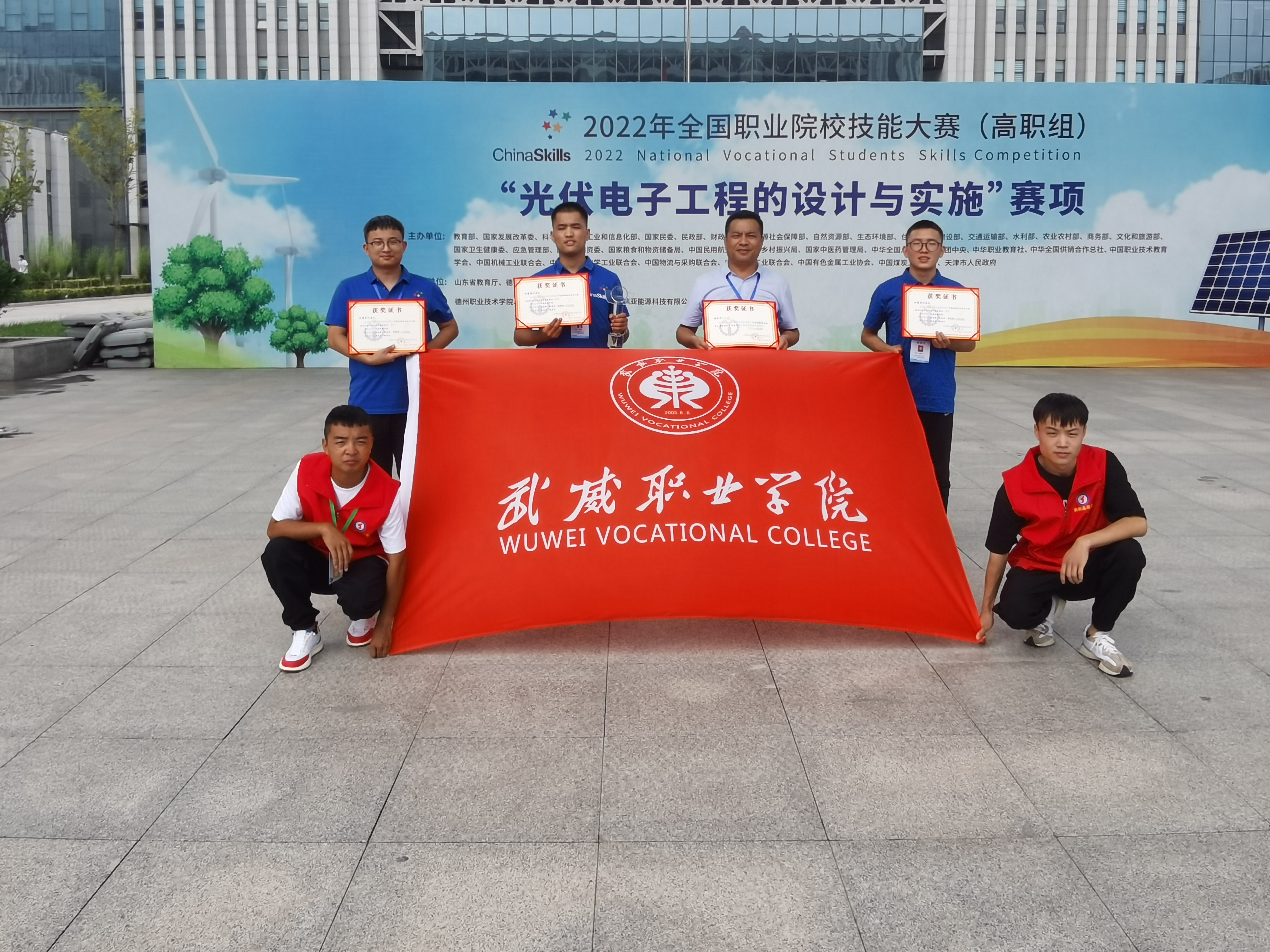 8月22日至23日,由教育部、工業(yè)和信息化部、財政部、人力資源和社會保障部、住房和城鄉(xiāng)建設(shè)部、交通運輸部、農(nóng)業(yè)部等部委主辦的2022年全國職業(yè)院校技能大賽高職組“光伏電子工程的設(shè)計與實施”賽項在山東德州職業(yè)技術(shù)學(xué)院舉辦,來自全國30個省(市)、自治區(qū)的55支代表隊參加了比賽。武威職業(yè)學(xué)院中科低碳新能源技術(shù)學(xué)院高東興、富金強、趙寶林三名同學(xué)代表甘肅省參加本次大賽,最終榮獲國賽一等獎,完全實現(xiàn)了賽前確定的“穩(wěn)二爭一”的目標(biāo)任務(wù)。這是學(xué)校參加全國職業(yè)院校技能大賽以來首次獲得國賽一等獎,實現(xiàn)了學(xué)校該賽項國獎“零”的突破,開啟了學(xué)校專業(yè)建設(shè)高質(zhì)量發(fā)展新征程。本次優(yōu)異成績的取得充分展現(xiàn)了學(xué)?!皪徴n賽證”相融通的綜合育人效果,充分體現(xiàn)了學(xué)校深化“三教改革”推動高質(zhì)量發(fā)展的成效,充分彰顯了學(xué)校實施“雙高計劃”“技能甘肅”“提質(zhì)培優(yōu)”等重大項目建設(shè)推進高水平發(fā)展的成效,本次競賽成績是對學(xué)校新能源類專業(yè)建設(shè)的肯定,也是武威乃至全省職業(yè)教育發(fā)展的試金石和榮光。