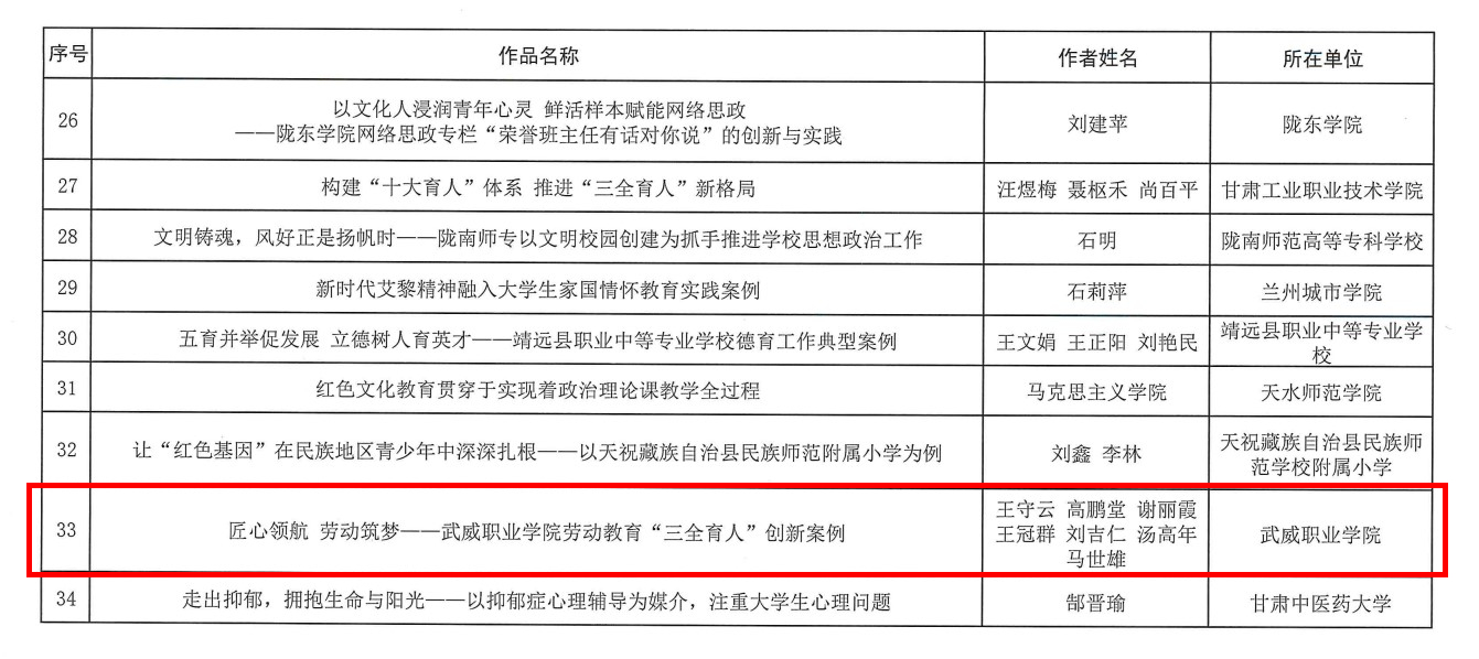 近日,2022年全省學(xué)校思想政治教育工作成果征集活動(dòng)評選結(jié)果公布,武威職業(yè)學(xué)院喜獲佳績,兩件作品獲獎(jiǎng)。其中,王守云、高鵬堂、謝麗霞、王冠群、劉吉仁、湯高年、馬世雄老師的《匠心領(lǐng)航 勞動(dòng)筑夢—武威職業(yè)學(xué)院勞動(dòng)教育“三全育人”創(chuàng)新案例》獲思想政治典型案例三等獎(jiǎng);張保海、馮文娟、謝麗霞老師的《基于“診改”的思政教育質(zhì)量評價(jià)體系構(gòu)建研究》獲思想政治論文三等獎(jiǎng)。