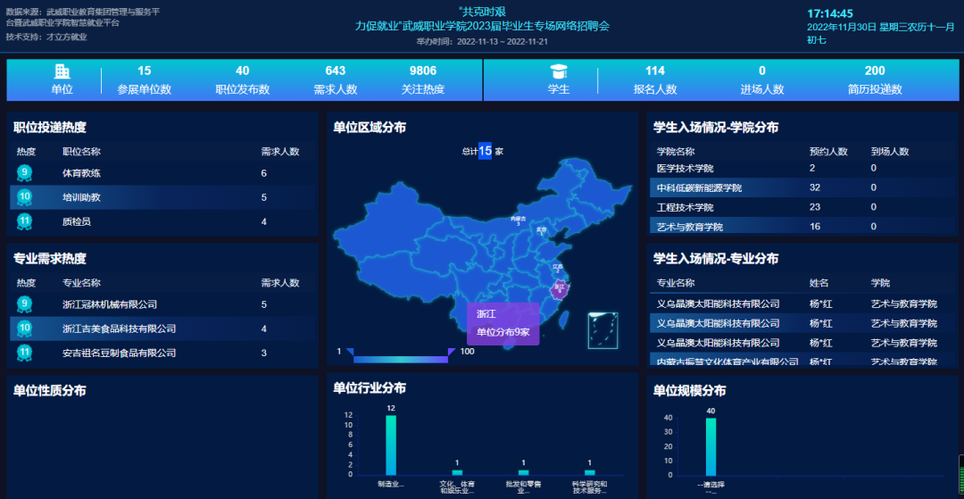 本次云聘系列活動分兩個(gè)階段舉行,第一階段為“共克時(shí)艱力促就業(yè)”武威職業(yè)學(xué)院2023屆畢業(yè)生專場網(wǎng)絡(luò)招聘會,于11月7日至11月21日舉行。本次招聘會主要面向在疫情條件下,能夠?qū)\嚱舆\(yùn)學(xué)生赴企業(yè)就業(yè)的單位。湖州市安吉縣人力資源和社會保障局組織10余家當(dāng)?shù)仄髽I(yè)參加了本次招聘會,同時(shí)吸引內(nèi)蒙古靈圣作物科技有限公司、江蘇京東信息技術(shù)有限公司、義烏晶澳太陽能科技有限公司、內(nèi)蒙古振慧文化體育產(chǎn)業(yè)有限公司等企業(yè)參加,提供招聘職位40個(gè),需求人數(shù)643人,招聘會關(guān)注人次達(dá)9806,200余人投遞簡歷。