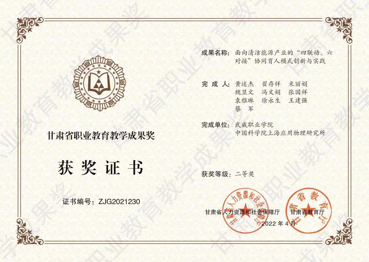 近日,甘肅省人力資源和社會(huì)保障廳、甘肅省教育廳下發(fā)《關(guān)于表彰2021年甘肅省職業(yè)教育教學(xué)成果獎(jiǎng)的決定》。我校中科低碳新能源技術(shù)學(xué)院與中國(guó)科學(xué)院上海應(yīng)用物理研究所聯(lián)合完成的《面向清潔能源產(chǎn)業(yè)的“四聯(lián)動(dòng)、六對(duì)接”協(xié)同育人模式創(chuàng)新與實(shí)踐》成果獲得二等獎(jiǎng)。