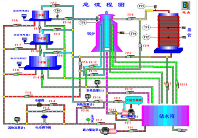 高級過程控制系統(tǒng)主要特點是被調(diào)參數(shù)囊括了流量、壓力、液位、溫度四大熱工參數(shù);執(zhí)行器中既有電動調(diào)節(jié)閥儀表類執(zhí)行機構,又有變頻器等電力拖動類執(zhí)行器。系統(tǒng)除了能改變調(diào)節(jié)器的設定值作階躍擾動外,還可在對象中通過電磁閥和手操作閥制造各種擾動。一個被調(diào)參數(shù)可用不同的動力源、不同的執(zhí)行器和不同的工藝線路下可演變成多種調(diào)節(jié)回路,以利于討論、比較各種調(diào)節(jié)方案的優(yōu)劣,從而進行多變量控制系統(tǒng)及特定的高級過程控制系統(tǒng)實驗。