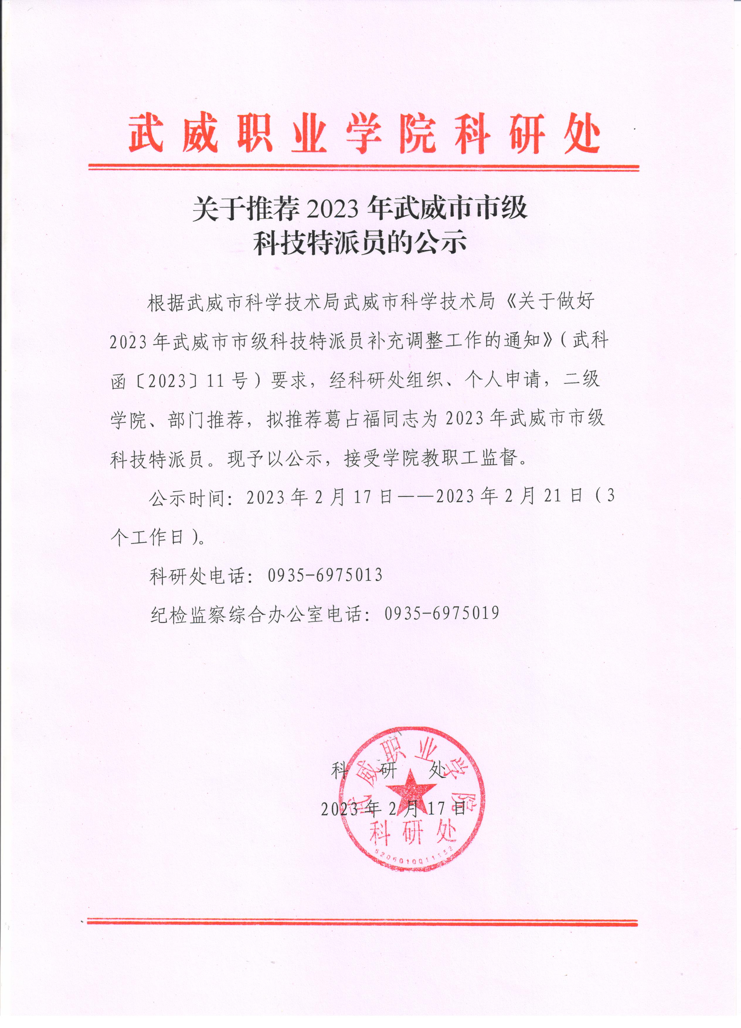關(guān)于擬推薦2023年武威市市級科技特派員人員的公示