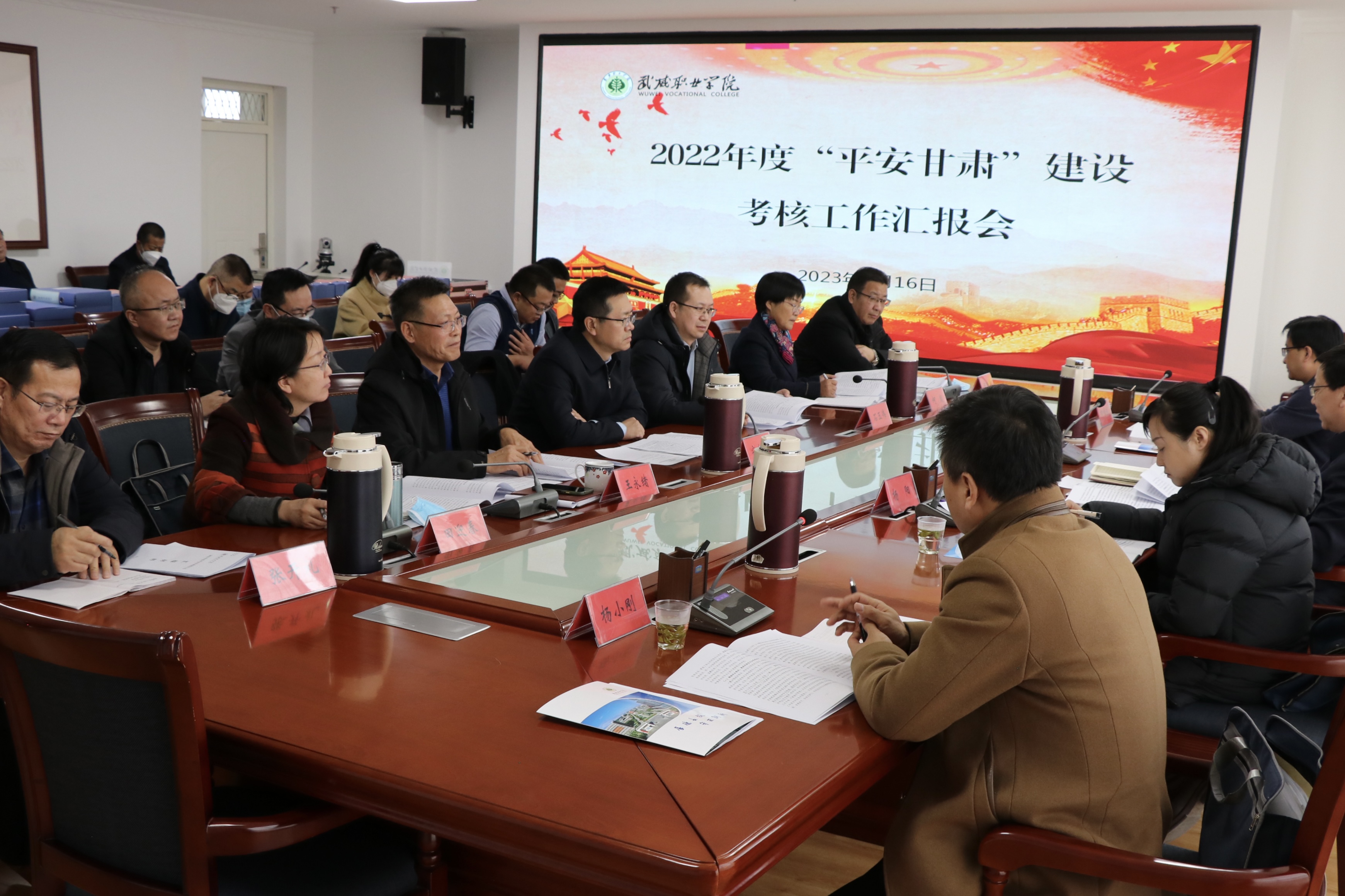 2月16日下午,平安甘肅建設(shè)第七考評組組長、省信訪局副局長劉全生帶領(lǐng)考評組一行來學(xué)校,檢查考核學(xué)校2022年度平安建設(shè)工作。學(xué)校黨委委員、副校長王永緒主持會議,武威市市委政法委副書記寧生剛、在家校領(lǐng)導(dǎo)班子成員,各部門、二級學(xué)院負(fù)責(zé)人參加匯報會。