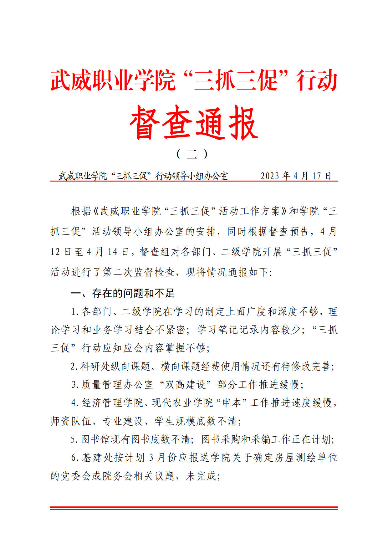 武威職業(yè)學(xué)院“三抓三促”行動(dòng)督查通報(bào)( 二 )