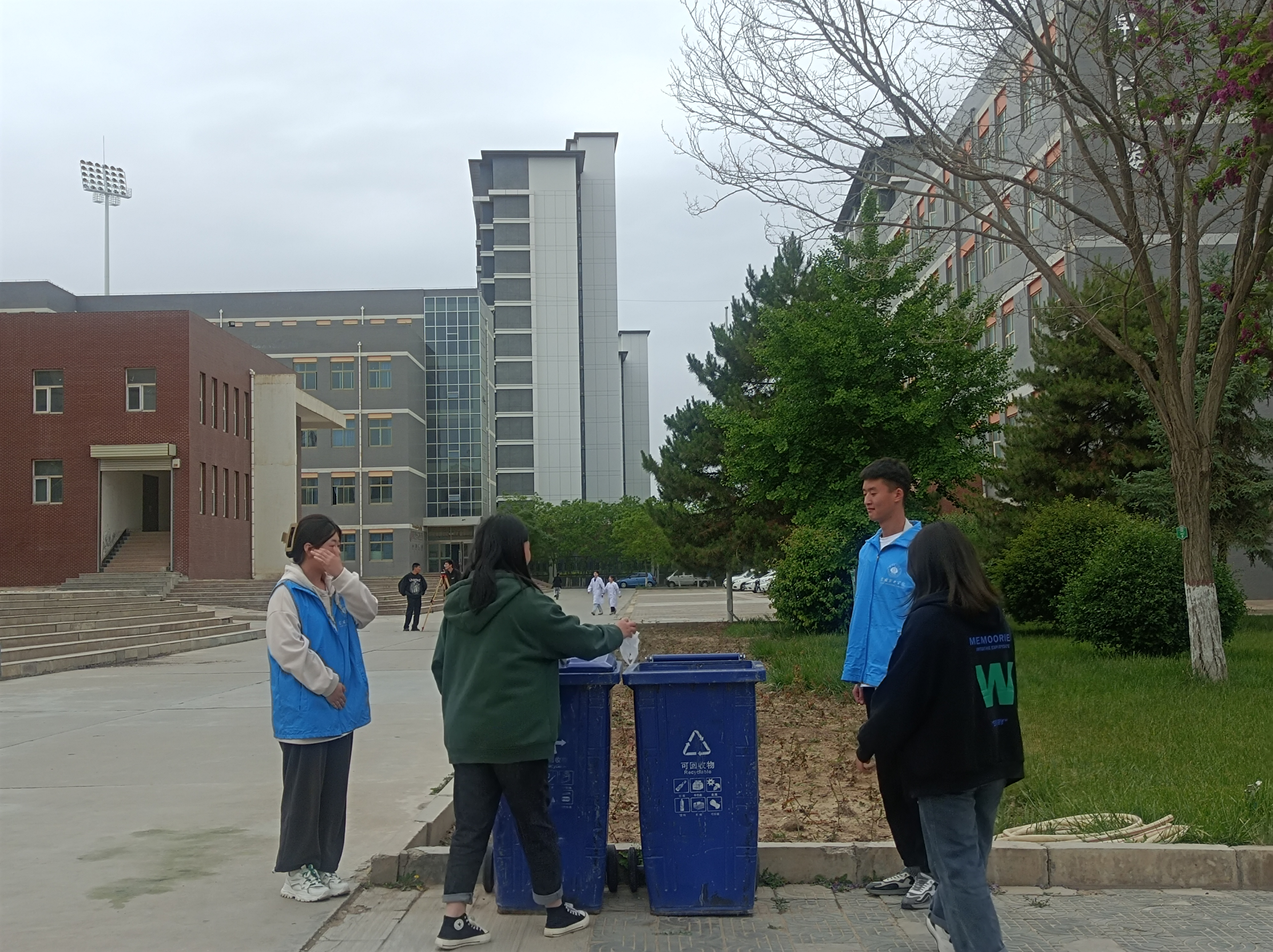? ? ? 志愿者們 積極參與生活垃圾分類宣傳,傳播“生態(tài)文明,從我做起"的生活理念,主動做垃圾分類知識的宣傳者、文明生活理念的倡導(dǎo)者、垃圾分類收集的志愿者,以實際行動帶動身邊人參與生活垃圾分類和勞動實踐中來。積極參加學(xué)校垃圾分類工作,從自身做起、從現(xiàn)在做起,正確分類垃圾,主動糾正錯誤的垃圾分類習(xí)慣,自覺將學(xué)習(xí)、工作、生活過程中產(chǎn)生的垃圾進行分類收集和投放,不隨意丟棄。志愿者積極的奔走在校園每一個角落,引導(dǎo)同學(xué)們做好垃圾分類,為同學(xué)們樹立起垃圾分類的意識。