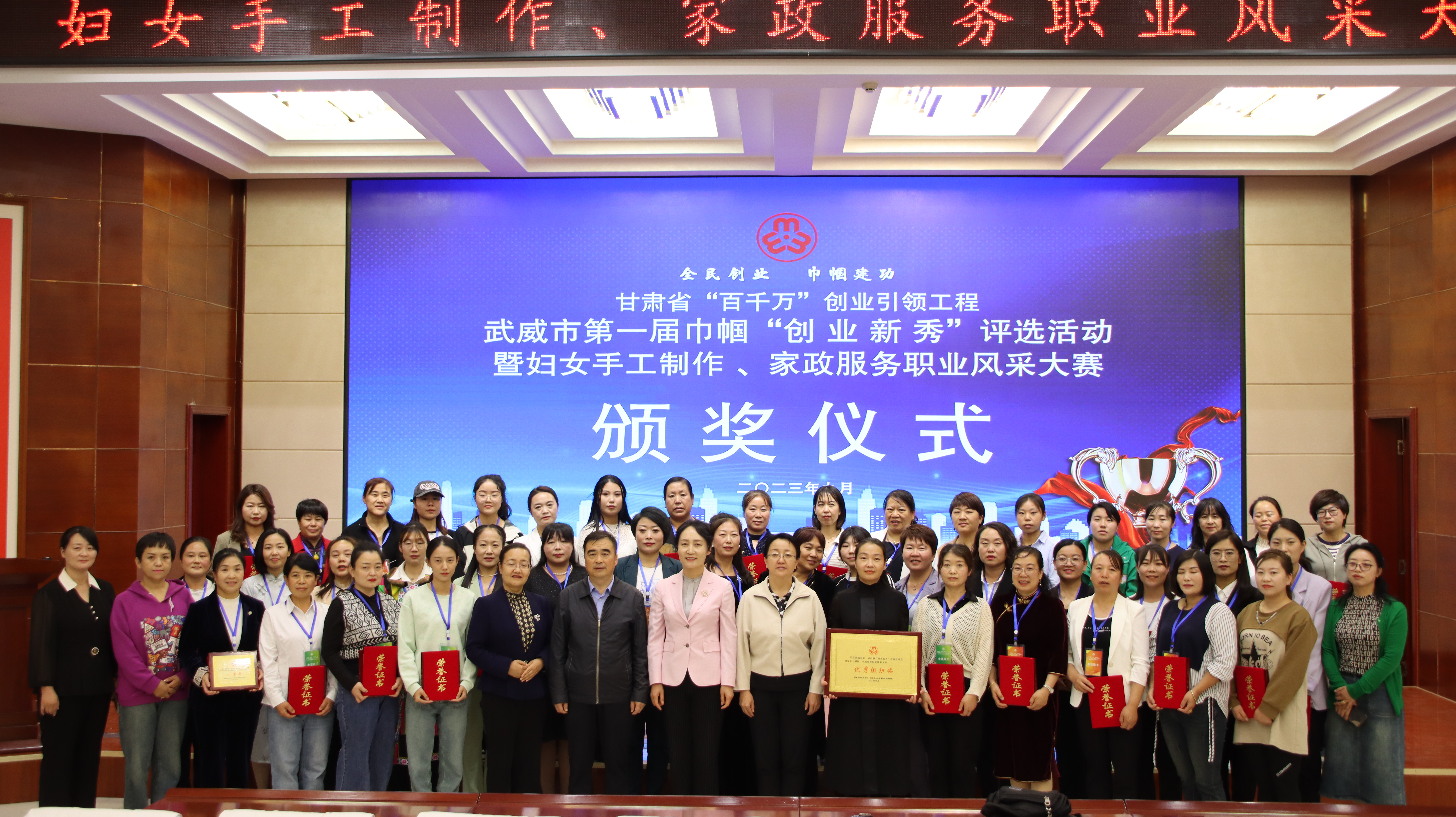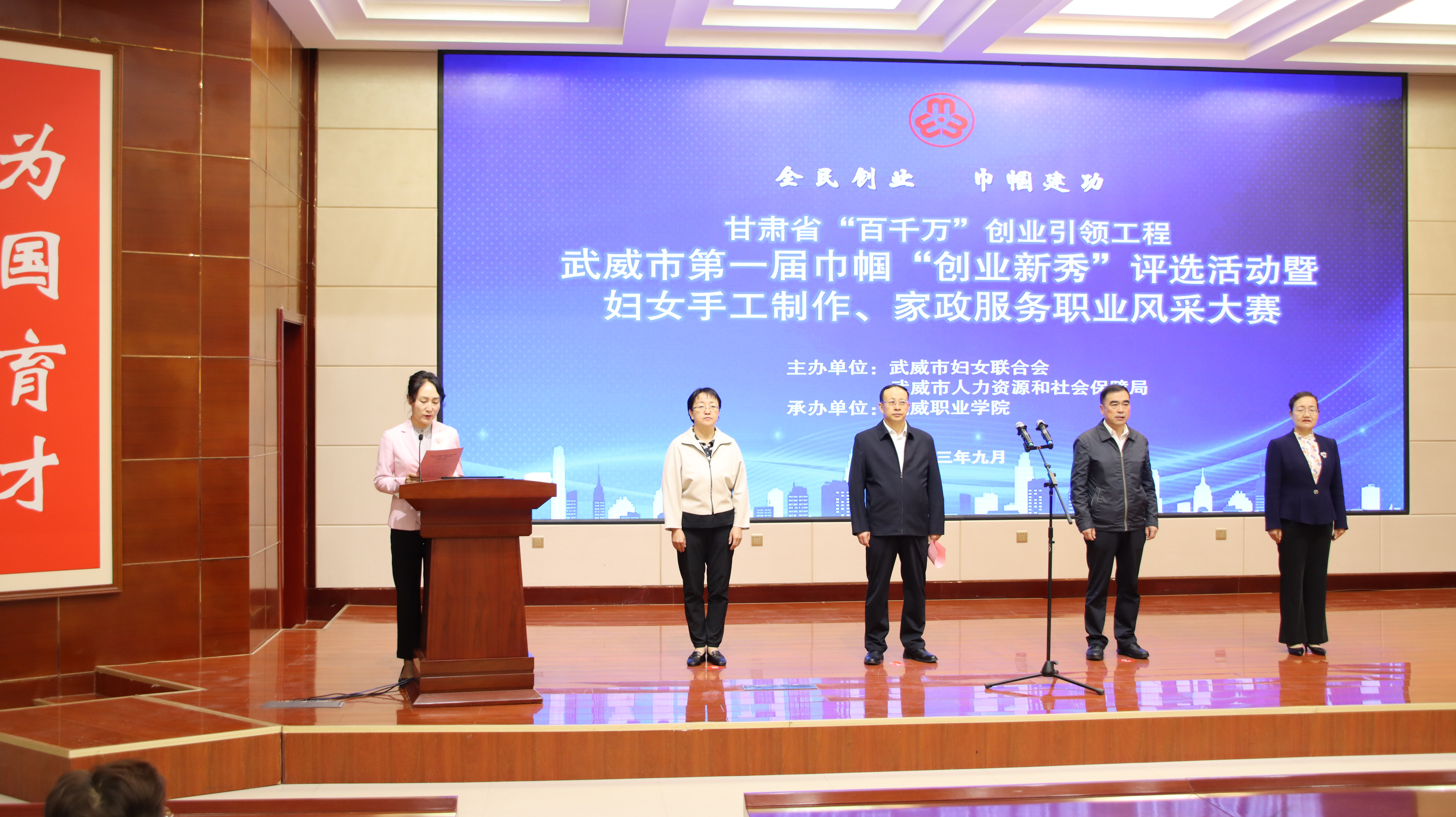 9 月 27 日,由市婦聯(lián)、市人社局主辦、我校承辦的甘肅省“百千萬”創(chuàng)業(yè)引領(lǐng)工程武威市第一屆巾幗“創(chuàng)業(yè)新秀”評(píng)選活動(dòng)暨婦女手工制作、家政服務(wù)職業(yè)風(fēng)采大賽成功舉辦,武威市人社局黨組書記,局長(zhǎng)陳昱川,市婦聯(lián)黨組書記,主席劉玉華,武威市就業(yè)局局長(zhǎng)魏斌,武威市婦聯(lián)副主席張惠華,縣區(qū)婦聯(lián)負(fù)責(zé)同志,學(xué)校黨委委員,副校長(zhǎng)田迎春出席本次活動(dòng),參賽選手等100 人參加大賽。